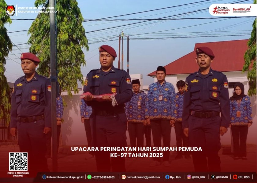 Senin, 28 Oktober 2025 - KPU Kabupaten Sumbawa Barat melaksanakan Upacara Peringatan Hari Sumpah Pemuda ke-97 Tahun 2025. Kegiatan ini berlangsung di halaman kantor KPU Kabupaten Sumbawa Barat dan diikuti oleh pejabat struktural dan staf pelaksana di lingkungan sekretariat KPU Kabupaten Sumbawa Barat. Upacara ini dipimpin oleh Ketua Divisi Teknis Penyelenggaraan KPU Kabupaten Sumbawa Barat, Bapak Supriadi, S.E., sebagai pembina upacara. Peringatan Hari Sumpah Pemuda ke-97 ini menjadi momentum penting untuk mengenang semangat dan perjuangan pemuda Indonesia dalam memperjuangkan kemerdekaan dan kemajuan bangsa. Semoga semangat Sumpah Pemuda dapat menjadi inspirasi bagi seluruh masyarakat Indonesia untuk terus berkontribusi dalam pembangunan bangsa. #HumasKPUKSB #KPUMelayani ....