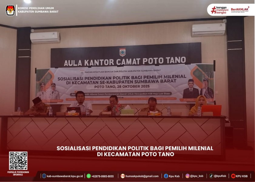 Selasa, 28 Oktober 2025 Ketua Divisi Sosialisasi, Pendidikan Pemilih, Partisipasi Masyarakat, dan SDM KPU Kabupaten Sumbawa Barat, Gufran, menjadi narasumber dalam kegiatan Sosialisasi Pendidikan Politik bagi Pemilih Milenial yang digelar di Kecamatan Poto Tano. Dalam paparannya, Gufran menyampaikan materi bertema “Peran Pemilih Muda Pasca Pemilihan Kepala Daerah Serentak Tahun 2024”. Ia menekankan pentingnya keterlibatan generasi muda dalam menjaga keberlanjutan demokrasi setelah pelaksanaan Pilkada serentak. Selain itu, Gufran juga memaparkan tingkat partisipasi pemilih pada pemilihan serentak tahun 2024, serta menekankan prinsip-prinsip integritas penyelenggara pemilu sebagai dasar kepercayaan publik terhadap proses demokrasi. Kegiatan sosialisasi ini diharapkan dapat meningkatkan kesadaran politik dan partisipasi aktif pemilih muda dalam setiap tahapan penyelenggaraan pemilu di Kabupaten Sumbawa Barat. #HumasKPUKSB #KPUMelayani ....