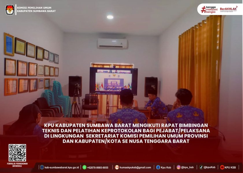 Selasa, 28 Oktober 2025 Komisi Pemilihan Umum (KPU) Kabupaten Sumbawa Barat mengikuti Rapat Bimbingan Teknis dan Pelatihan Keprotokolan bagi Pejabat/Pelaksana di lingkungan Sekretariat Komisi Pemilihan Umum Provinsi dan Kabupaten/Kota se-Nusa Tenggara Barat secara daring. #HumasKPUKSB #KPUMelayani ....