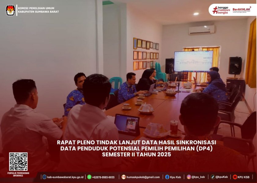 Selasa 28 Oktober 2025 — Komisi Pemilihan Umum (KPU) Kabupaten Sumbawa Barat melaksanakan Rapat Pleno Tindak Lanjut Data Hasil Sinkronisasi Data Penduduk Potensial Pemilih Pemilihan (DP4) Semester II Tahun 2025. Kegiatan ini dibuka dan di Pimpin oleh Ketua Divisi Perencanaan, Data, dan Informasi Doni MasAde KPU Kabupaten Sumbawa Barat sekaligus memaparkan hasil sinkronisasi data penduduk potensial pemilih pemilihan Semester II Tahun 2025, dan tindak lanjut atas hasil singkronisasi tersebut. Rapat pleno yang berlangsung di Aula Utama KPU Kabupaten Sumbawa Barat tersebut dihadiri oleh anggota KPU serta para kepala subbagian sekretariat KPU Kabupaten Sumbawa Barat. #HumasKPUKSB #KPUMelayani ....