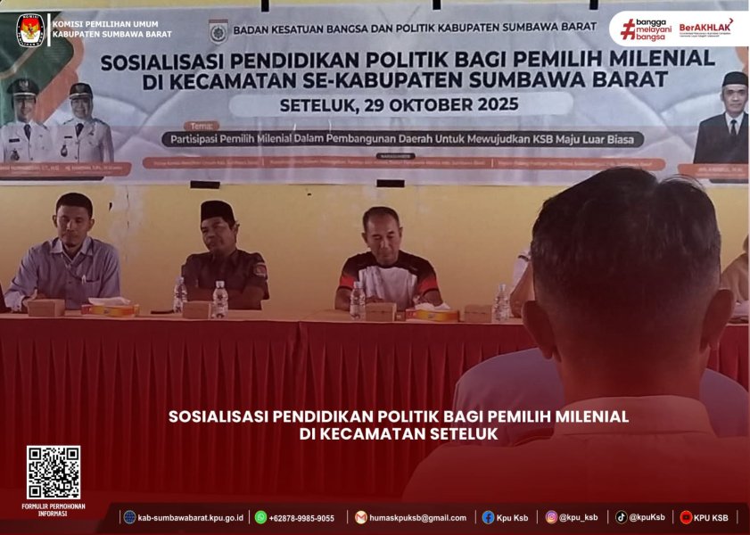 Rabu, 29 Oktober 2025 - Ketua Divisi Teknis Penyelenggaraan Pemilu KPU Kabupaten Sumbawa Barat, Supriadi, menjadi narasumber dalam acara Sosialisasi Pendidikan Politik bagi Pemilih Milenial di Kecamatan Seteluk. Dalam kegiatan tersebut, Supriadi menyampaikan materi tentang pentingnya peran pemuda dalam proses demokrasi, baik dalam Pemilu maupun Pilkada, serta dalam pembangunan daerah dan nasional. Supriadi menekankan bahwa pemuda memiliki peran strategis dalam menentukan masa depan bangsa dan negara. Oleh karena itu, pemuda perlu dibekali dengan pengetahuan dan kesadaran politik yang baik untuk dapat berpartisipasi aktif dalam proses demokrasi dan pembangunan. Dengan adanya kegiatan ini, diharapkan pemilih milenial di Kecamatan Seteluk dapat lebih memahami hak dan kewajiban mereka sebagai warga negara dan dapat menjadi bagian penting dalam pembangunan daerah dan nasional. #HumasKPUKSB #KPUMelayani ....