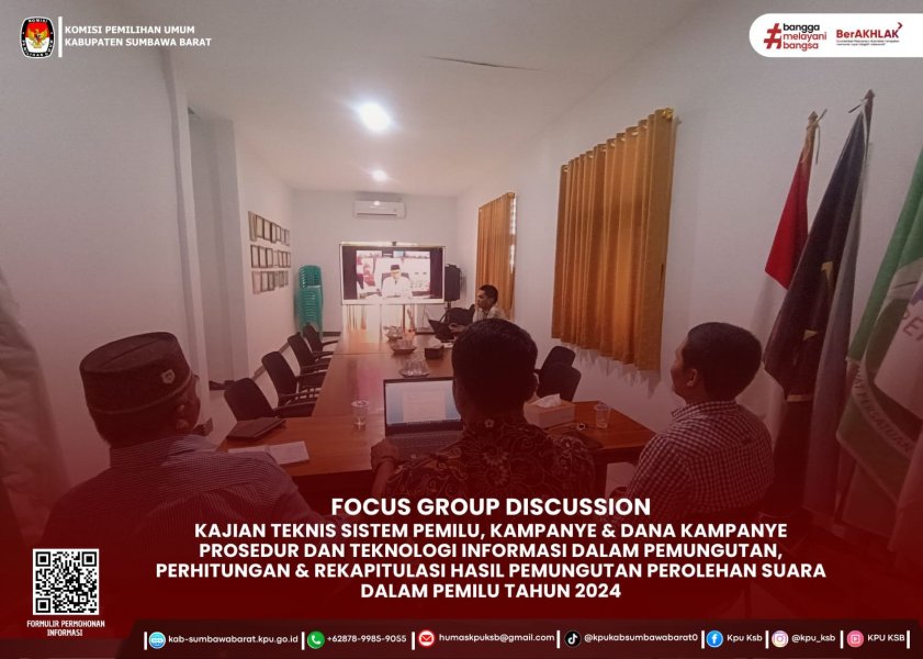 Senin, 29 September 2025 - Ketua dan Anggota Divisi Teknis dan Sosdiklih, Parmas dan SDM serta Subbagian Teknis dan Hukum KPU Kabupaten Sumbawa Barat mengikuti Focus Group Discussion (FGD) kajian teknis sistem pemilu, kampanye, dan dana kampanye, serta prosedur dan teknologi informasi dalam pemungutan, perhitungan, dan rekapitulasi hasil pemungutan perolehan suara dalam Pemilu tahun 2024.   Kegiatan ini diselenggarakan oleh KPU Provinsi Nusa Tenggara Barat dan dihadiri oleh seluruh KPU Kabupaten/Kota se-NTB melalui Zoom Metting. FGD ini bertujuan untuk meningkatkan pemahaman dan keseragaman teknis dalam pelaksanaan Pemilu, serta meningkatkan kualitas pelayanan kepada masyarakat.   Dengan adanya kegiatan ini, diharapkan KPU Sumbawa Barat dan KPU Kabupaten/Kota lainnya di NTB dapat meningkatkan kapasitas dan kualitas pelaksanaan Pemilu, serta memastikan proses Pemilu yang transparan dan akuntabel.   #HumasKPUKSB #KPUMelayani