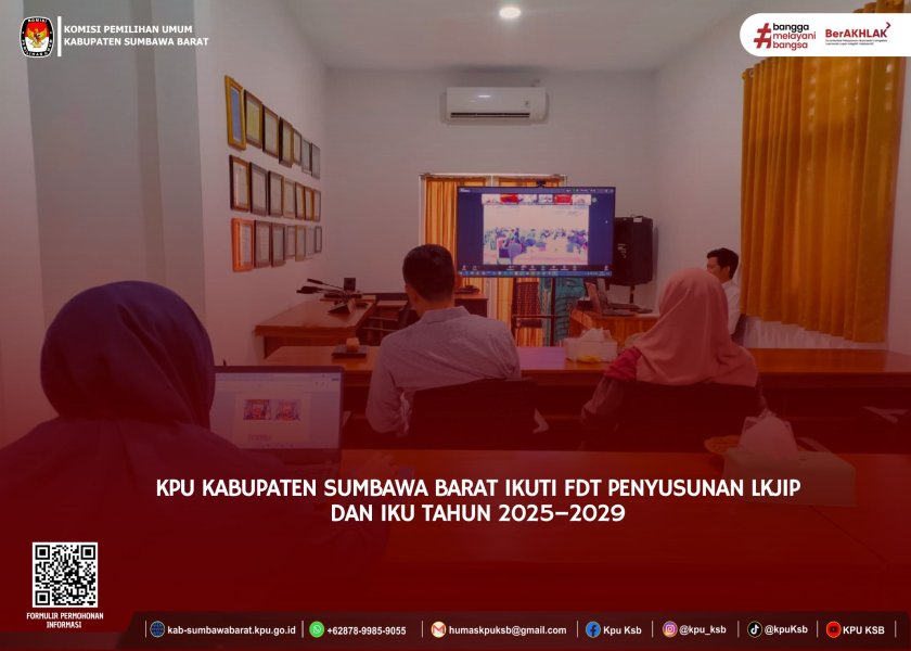 KPU Kabupaten Sumbawa Barat mengikuti kegiatan Forum Diskusi Terpumpun (FDT) Penyusunan Laporan Kinerja Instansi Pemerintah (LKjIP) KPU Tahun 2025 serta Penyusunan Cascading Kinerja dan Indikator Kinerja Utama (IKU) KPU, KPU Provinsi, dan KPU Kabupaten/Kota Tahun 2025–2029. Kegiatan tersebut dilaksanakan pada Selasa, 27 Januari 2026, dan diikuti secara daring dari Aula Kantor KPU Kabupaten Sumbawa Barat.