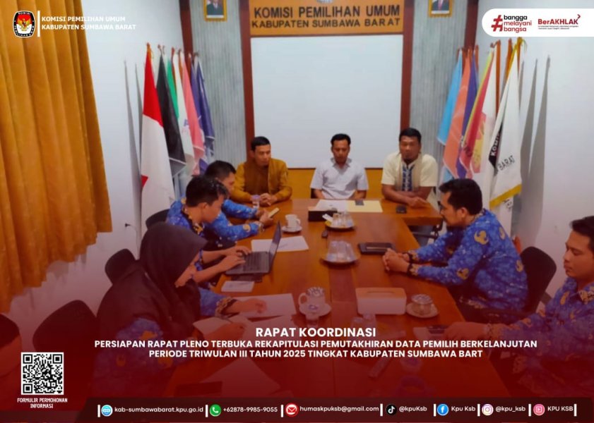 Rabu, 1 Oktober 2025 - KPU Kabupaten Sumbawa Barat melaksanakan Rapat Koordinasi Persiapan Rapat Pleno Terbuka Rekapitulasi Pemutakhiran Data Pemilih Berkelanjutan Periode Triwulan III Tahun 2025 Tingkat Kabupaten Sumbawa Barat. Kegiatan ini dibuka oleh Ketua Divisi Sosdiklih, Parmas dan SDM, Gufran, di aula kantor KPU Sumbawa Barat.