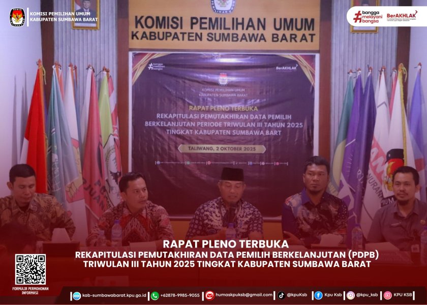 Kamis, 2 Oktober 2025 KPU Kabupaten Sumbawa Barat telah melaksanakan Rapat Pleno Terbuka Rekapitulasi Pemutakhiran Data Pemilih Berkelanjutan Periode Triwulan III bertempat di Aula Kantor Kabupaten Sumbawa Barat. Peserta rapat pleno dihadiri oleh stakeholder terkait yaitu Bawaslu, TNI, Polri, Bakesbangpoldagri, BPS dan BPJS Kesehatan Kabupaten Sumbawa Barat.