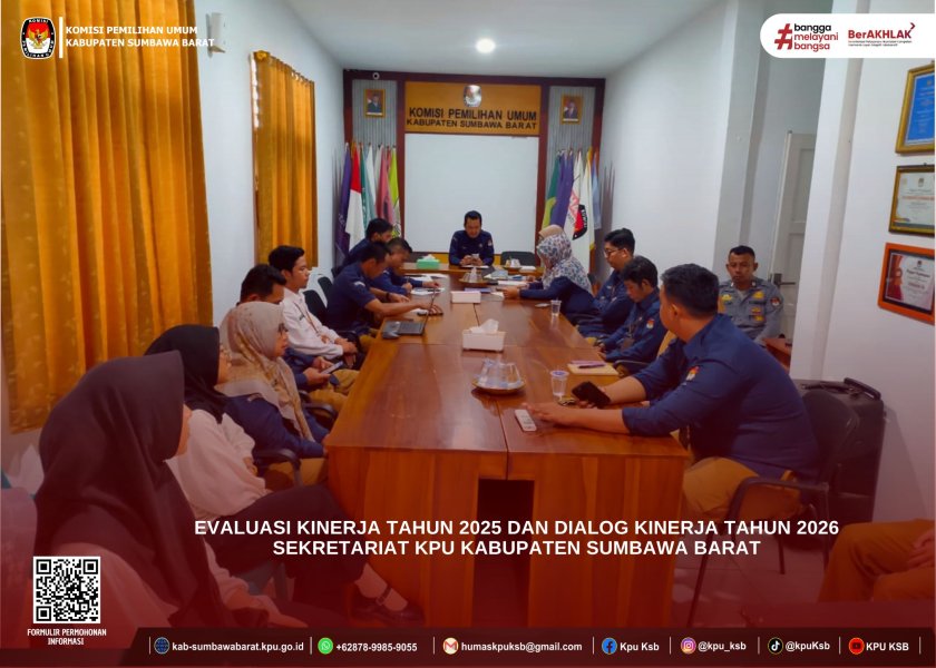 Sebagai bentuk komitmen bersama dalam meningkatkan kualitas tata kelola kelembagaan dan pelayanan kepemiluan Sekretariat Komisi Pemilihan Umum Kabupaten Sumbawa Barat menggelar Evaluasi Kinerja Tahun 2025 dan Dialog Kinerja Tahun 2026, yang dilaksanakan pada Selasa, 19 Januari 2026, bertempat di Aula Rapat Kantor KPU Kabupaten Sumbawa Barat. Kegiatan ini bertujuan untuk menilai capaian kinerja Sekretariat KPU Kabupaten Sumbawa Barat selama Tahun 2025 sekaligus menyusun langkah strategis dan perencanaan program kerja untuk Tahun 2026. Rapat diikuti oleh seluruh jajaran pegawai di lingkungan Sekretariat.
