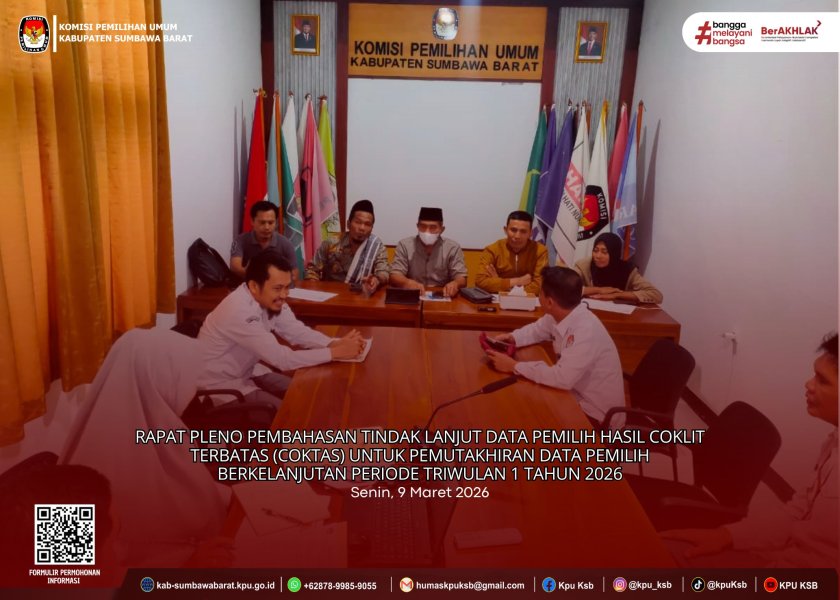 Senin, 9 Maret 2026 - KPU Kabupaten Sumbawa Barat melaksanakan Rapat Pleno pembahasan tindak lanjut data pemilih hasil pencocokan dan penelitian terbatas (coklit terbatas/COKTAS) dalam rangka Pemutakhiran Data Pemilih Berkelanjutan (PDPB) Periode Triwulan I Tahun 2026.