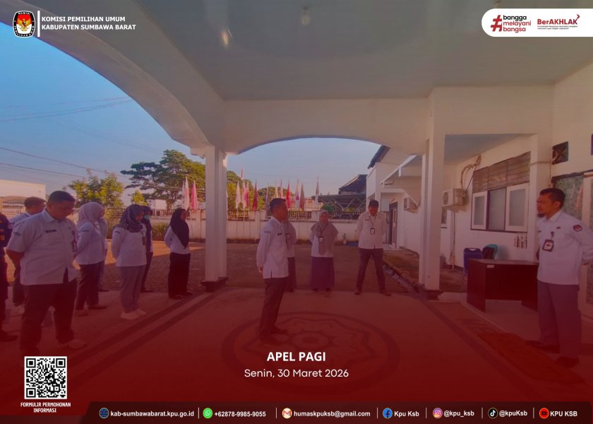 Senin, 30 Maret 2026 - KPU Kabupaten Sumbawa Barat melaksanakan apel pagi pasca cuti bersama Idulfitri yang dipimpin oleh Sekretaris KPU Kabupaten Sumbawa Barat, Lalu Amrullah. Dalam arahannya, beliau menekankan pentingnya menjaga integritas dan kedisiplinan seluruh pegawai dalam menjalankan tugas dan tanggung jawab. Kegiatan kemudian dilanjutkan dengan halal bihalal sebagai bentuk mempererat kebersamaan antar pegawai.