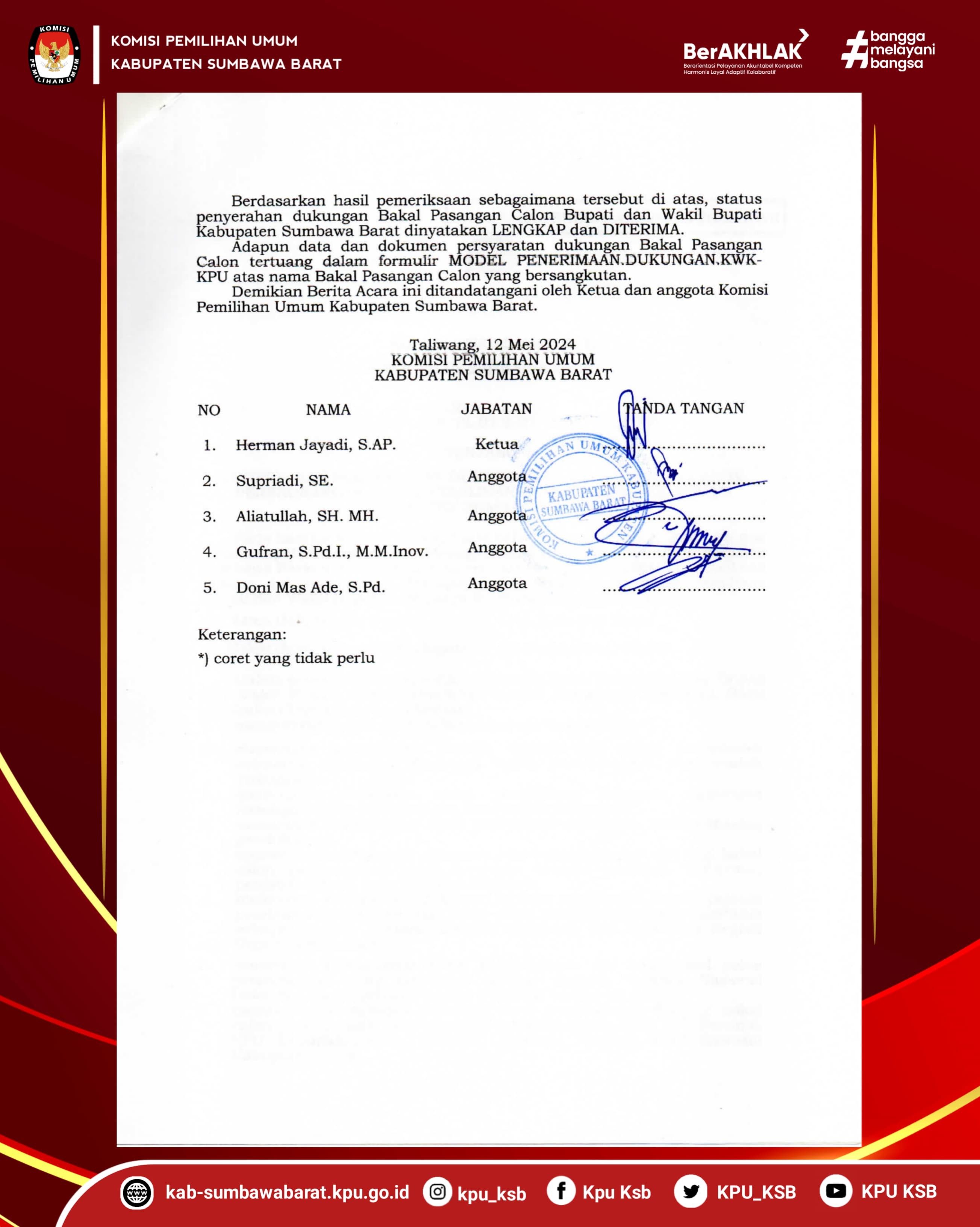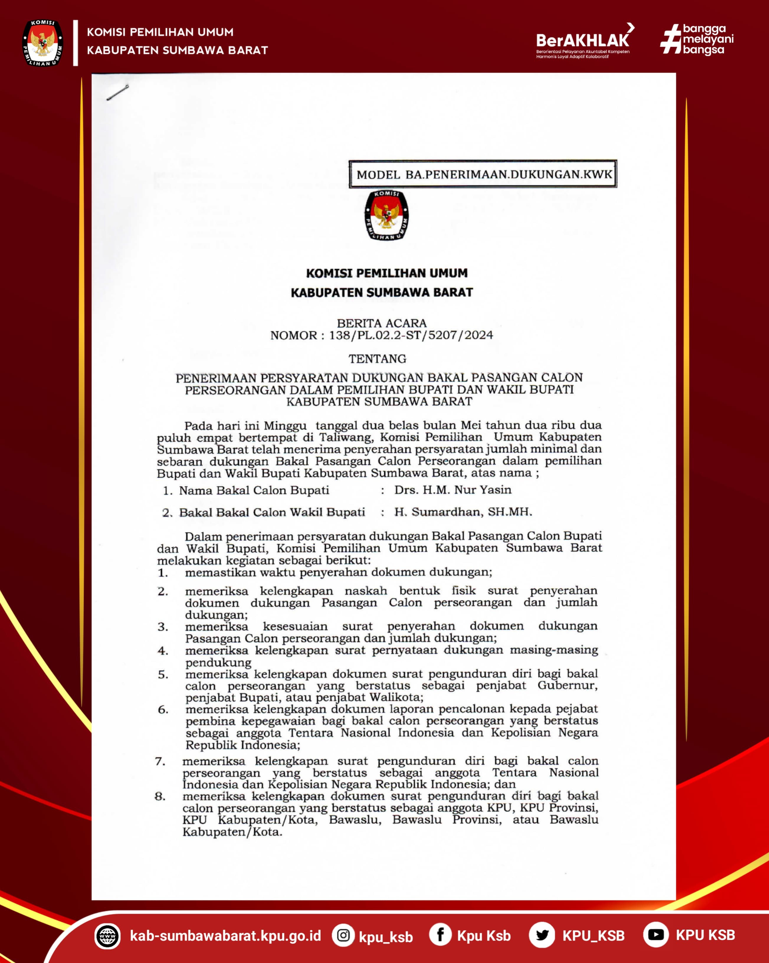 Berita Acara Nomor : 138/PL.02.2-ST/5207/2024 Tentang Penerimaan Syarat Dukungan Bakal Pasangan Calon Perseorangan Dalam Pemilihan Bupati Dan Wakil Bupati Kabupaten Sumbawa Barat