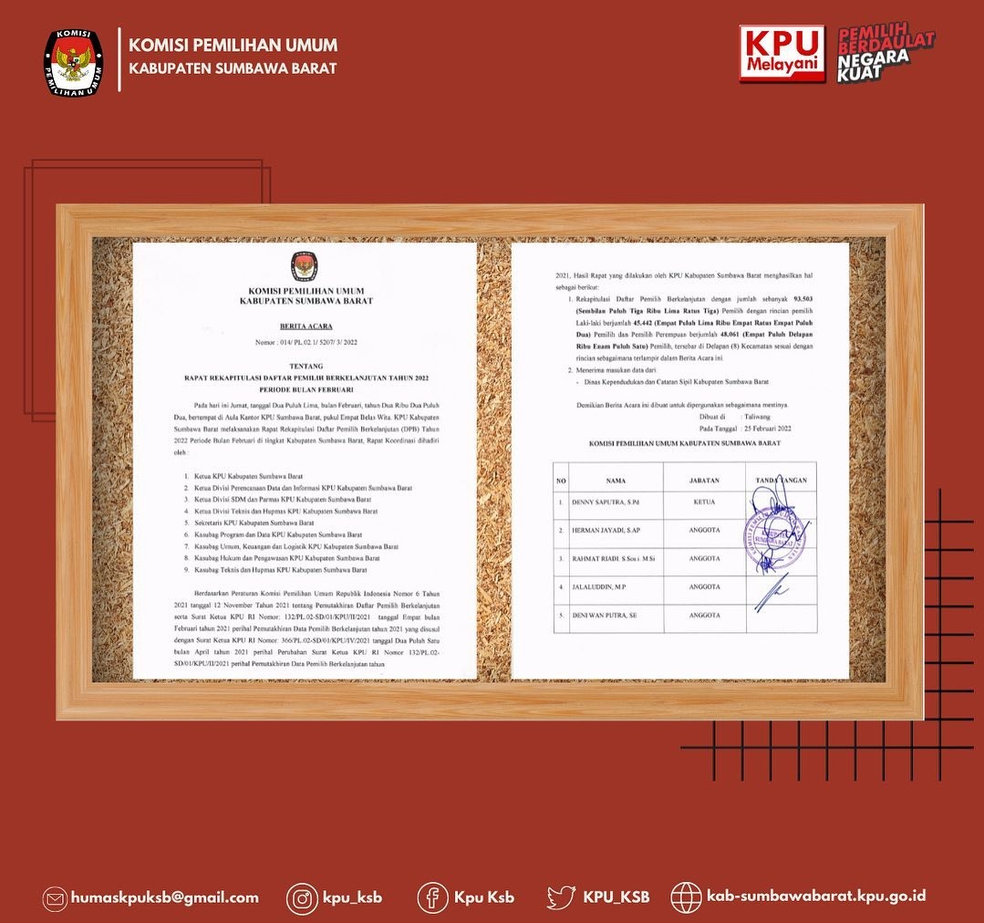 Jum’at (25/02/2022) Ketua Komisi Pemilihan Umum Kabupaten Sumbawa Barat, Bapak Denny Saputra, S.Pd. memimpin rapat Rekapitulasi Daftar Pemilih Berkelanjutan Periode bulan Februari. Rapat Rekapitulasi diikuti oleh Ketua dan Anggota KPU, Sekretaris dan seluruh Kasubbag lingkup KPU Kabupaten Sumbawa Barat.