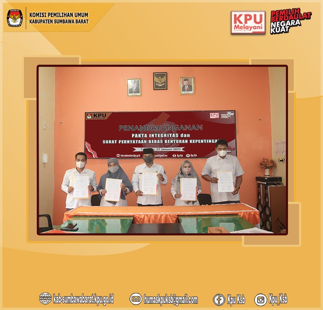 Dalam rangka mewujudkan manajemen lembaga yang bersih, transparan, profesional, dan berintegritas. KPU Kabupaten Sumbawa Barat melaksanakan Penandatanganan Pakta Integritas dan Surat Pernyataan Bebas Benturan Kepentingan yang dilaksanakan pada hari kamis, 27 Januari Tahun 2022 bertempat di ruang aula kantor KPU Kabupaten Sumbawa Barat. Kegiatan tersebut dibuka langsung oleh Ketua KPU Kabupaten Sumbawa Barat yang dihadiri oleh Anggota KPU, Sekretaris, Kasubbag dan seluruh Staf sekretariat lingkup KPU Kab. Sumbawa Barat.