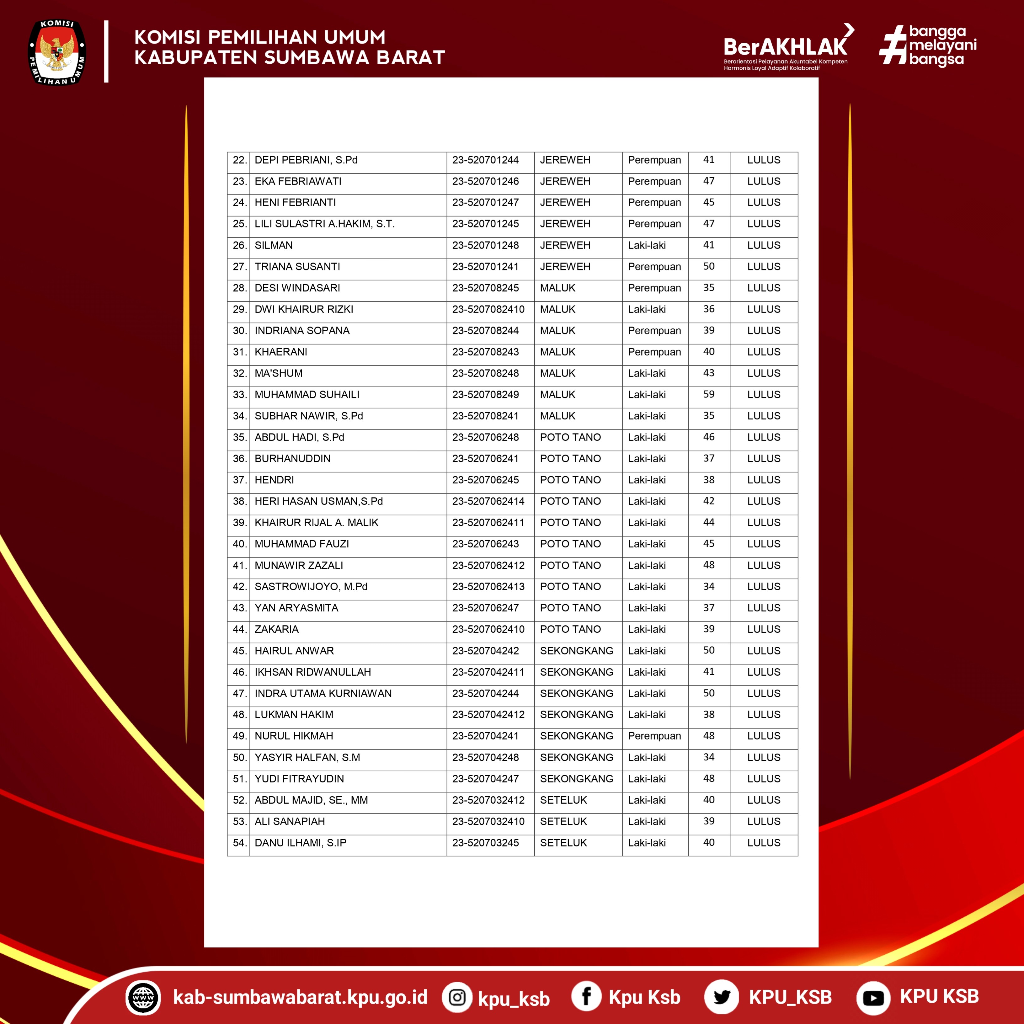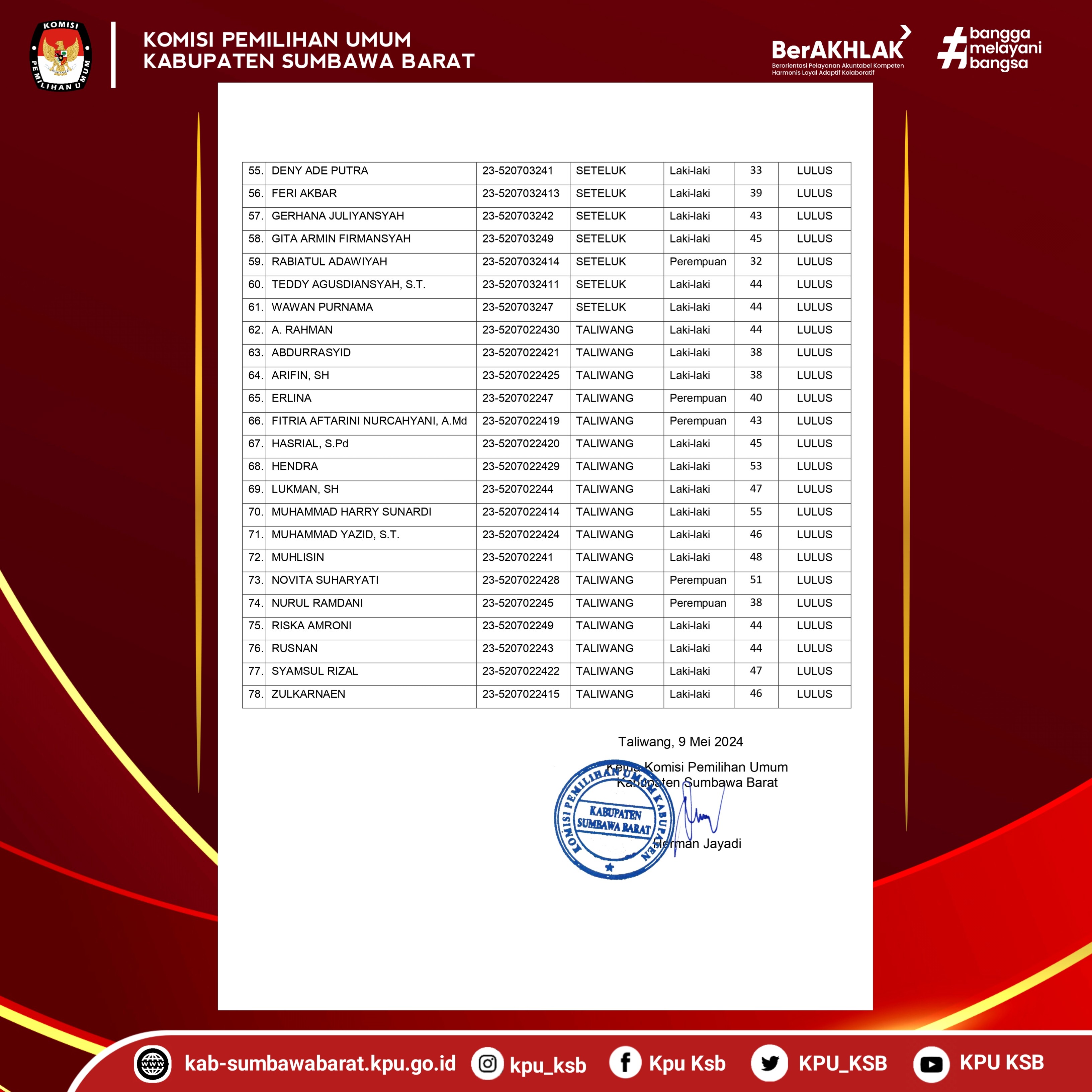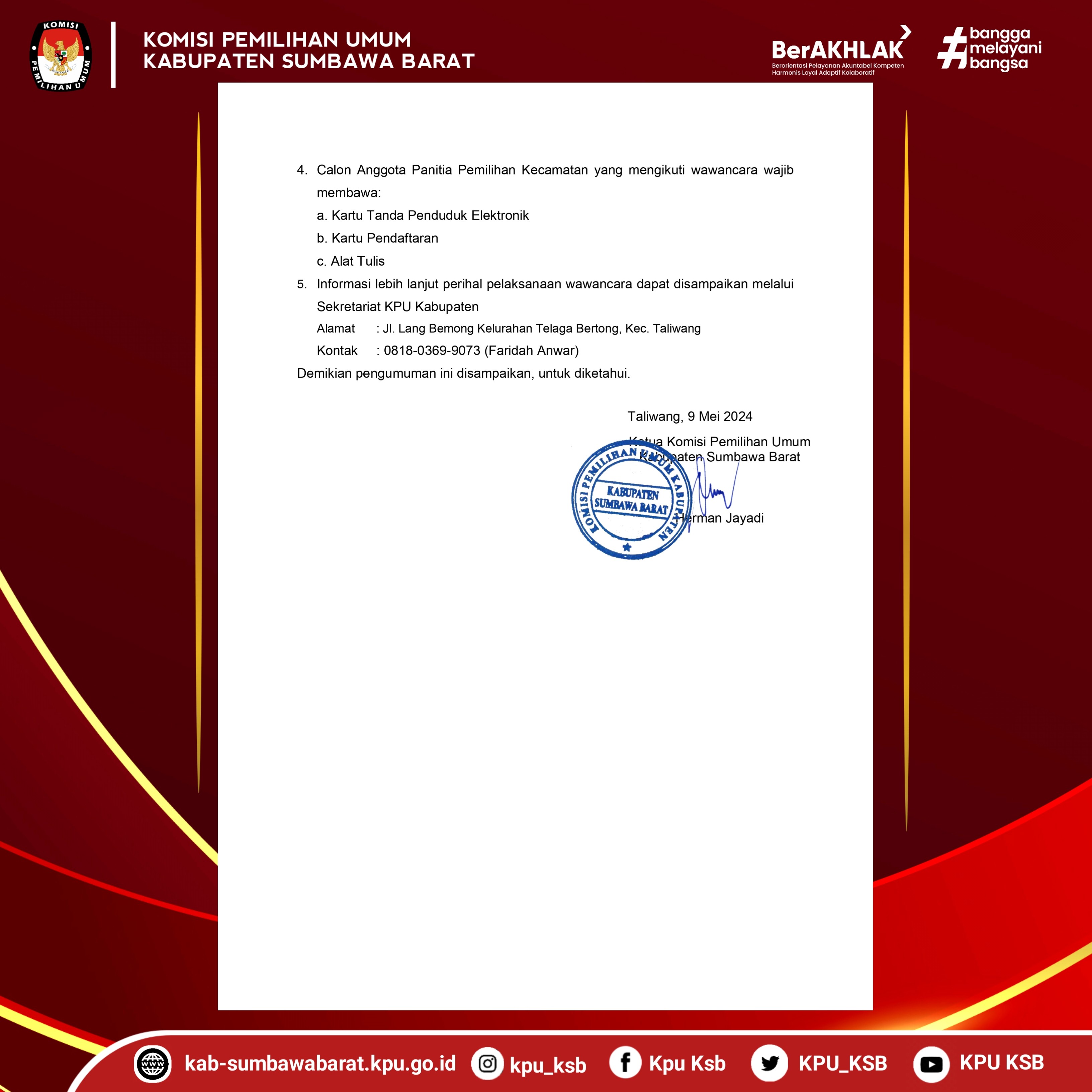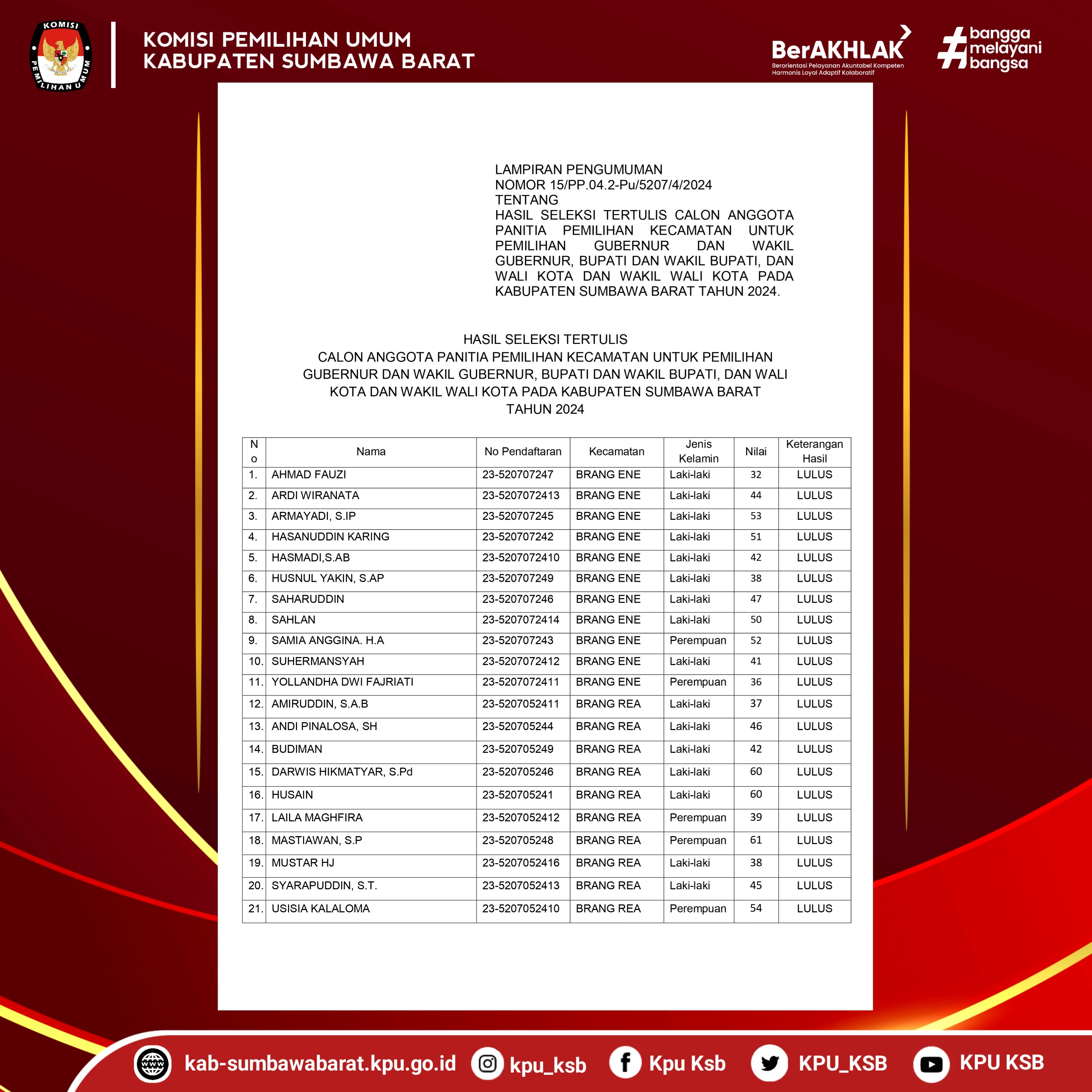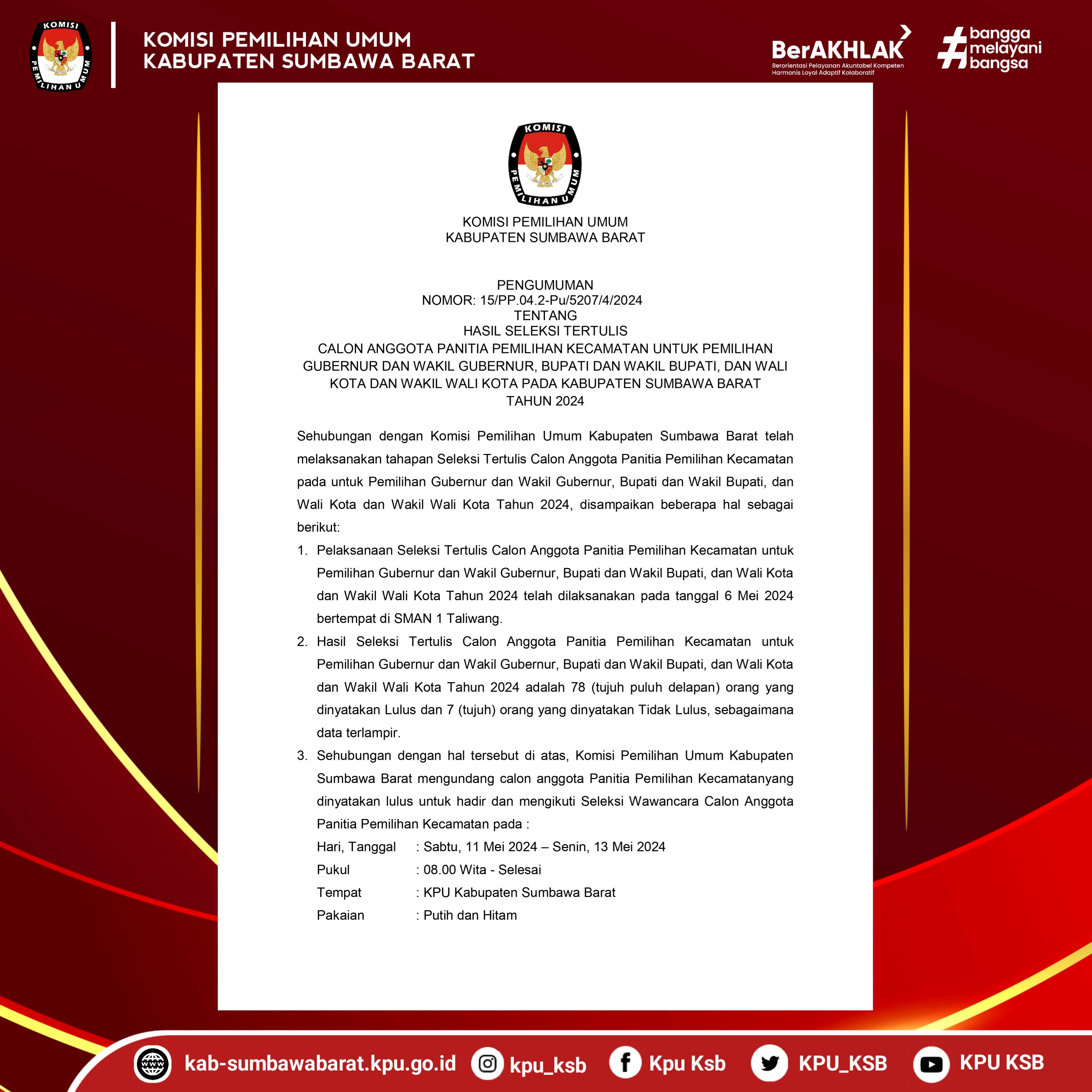Pengumuman Nomor 15/PP.04.2-Pu/5207/4/2024 tentang Hasil Seleksi Tertulis Calon Anggota Panitia Pemilihan Kecamatan untuk Pilkada Tahun 2024 pada Kabupaten Sumbawa Barat