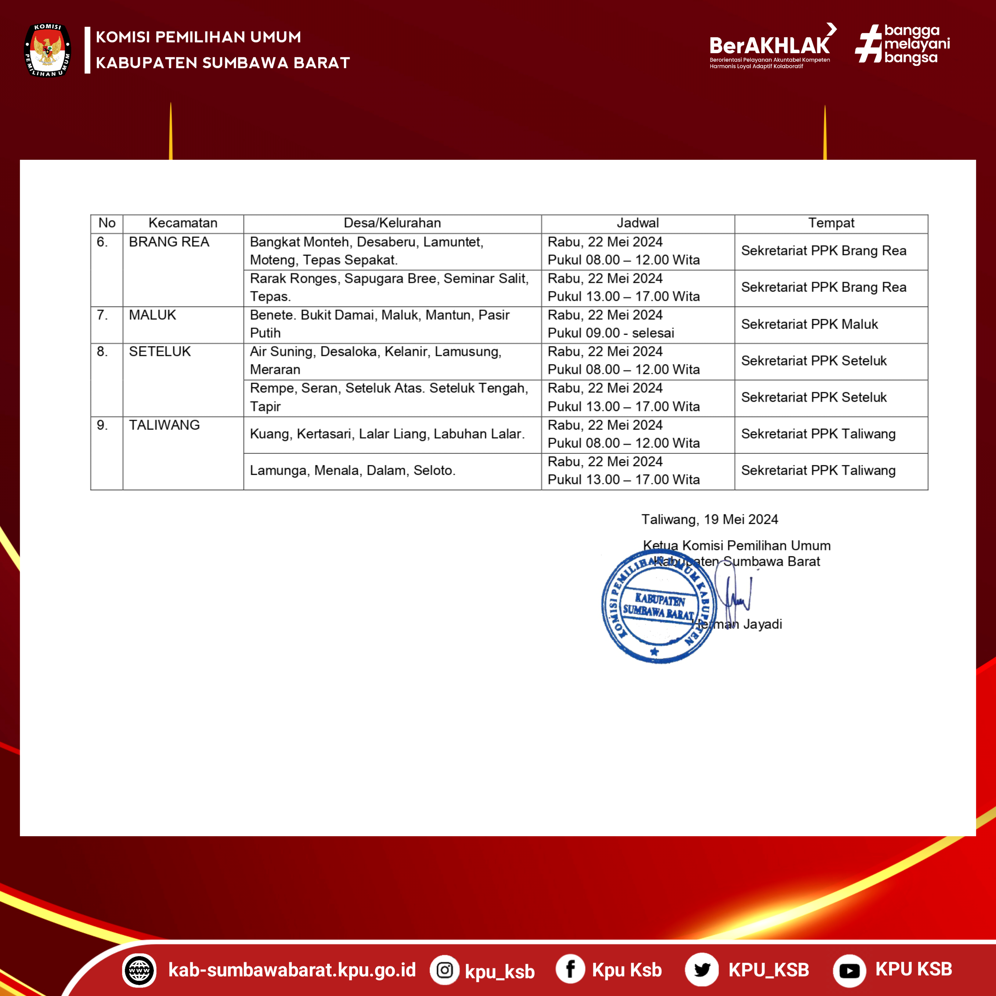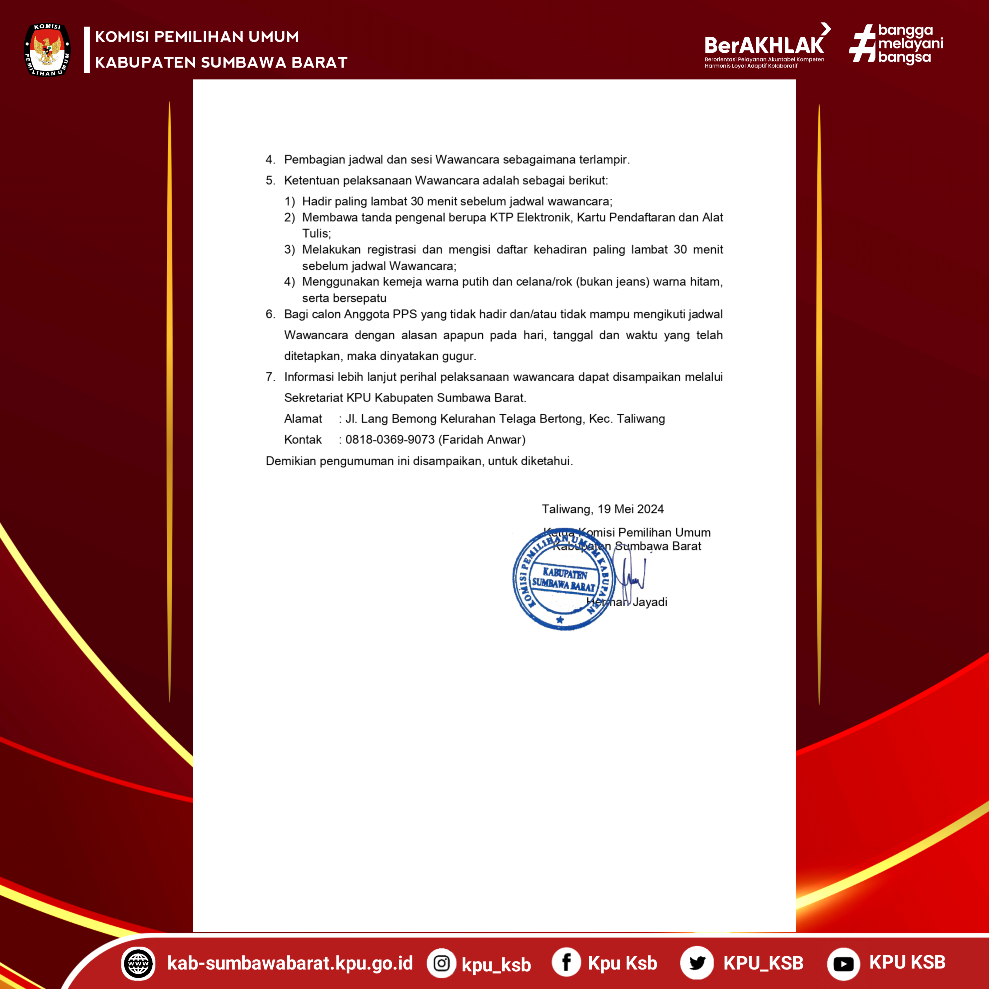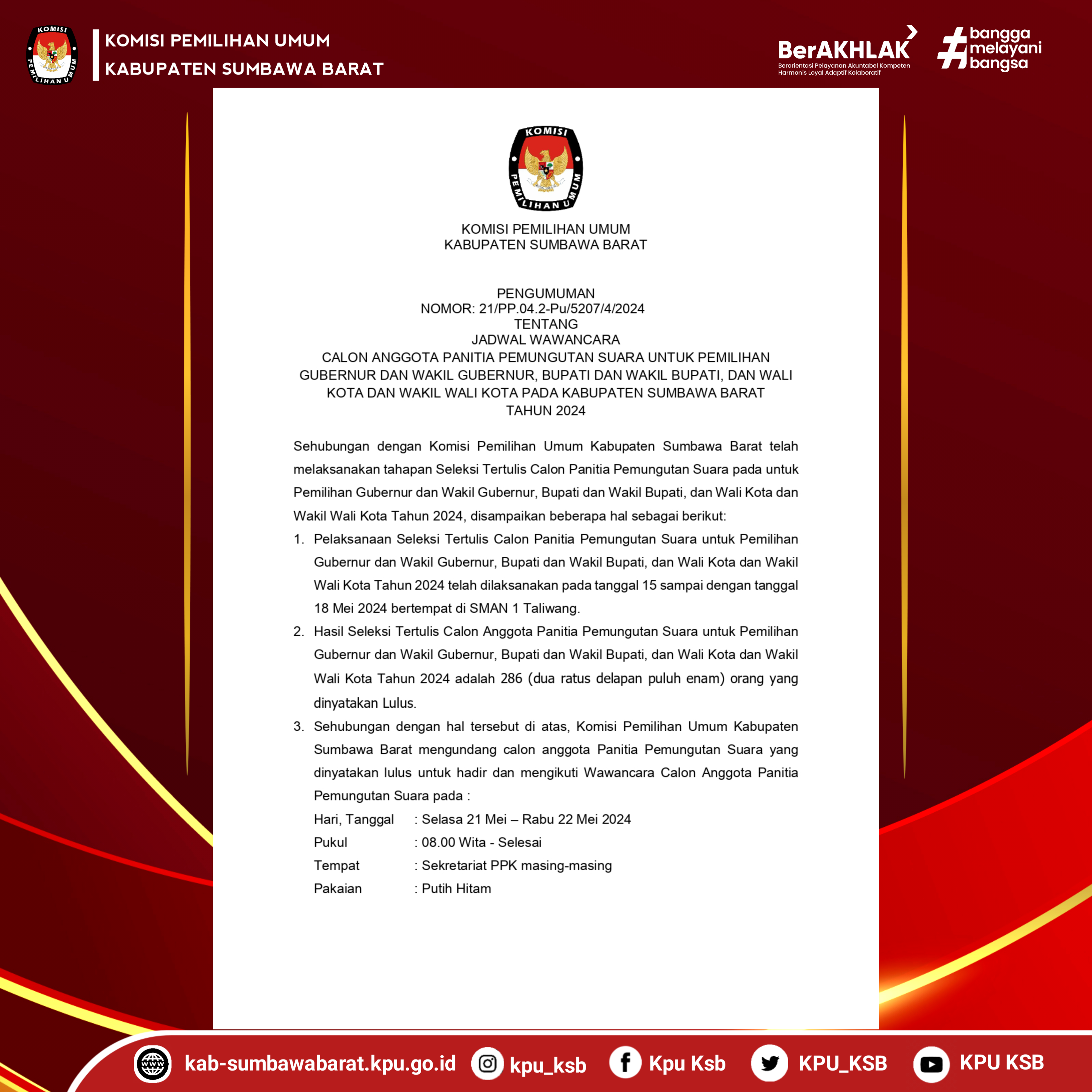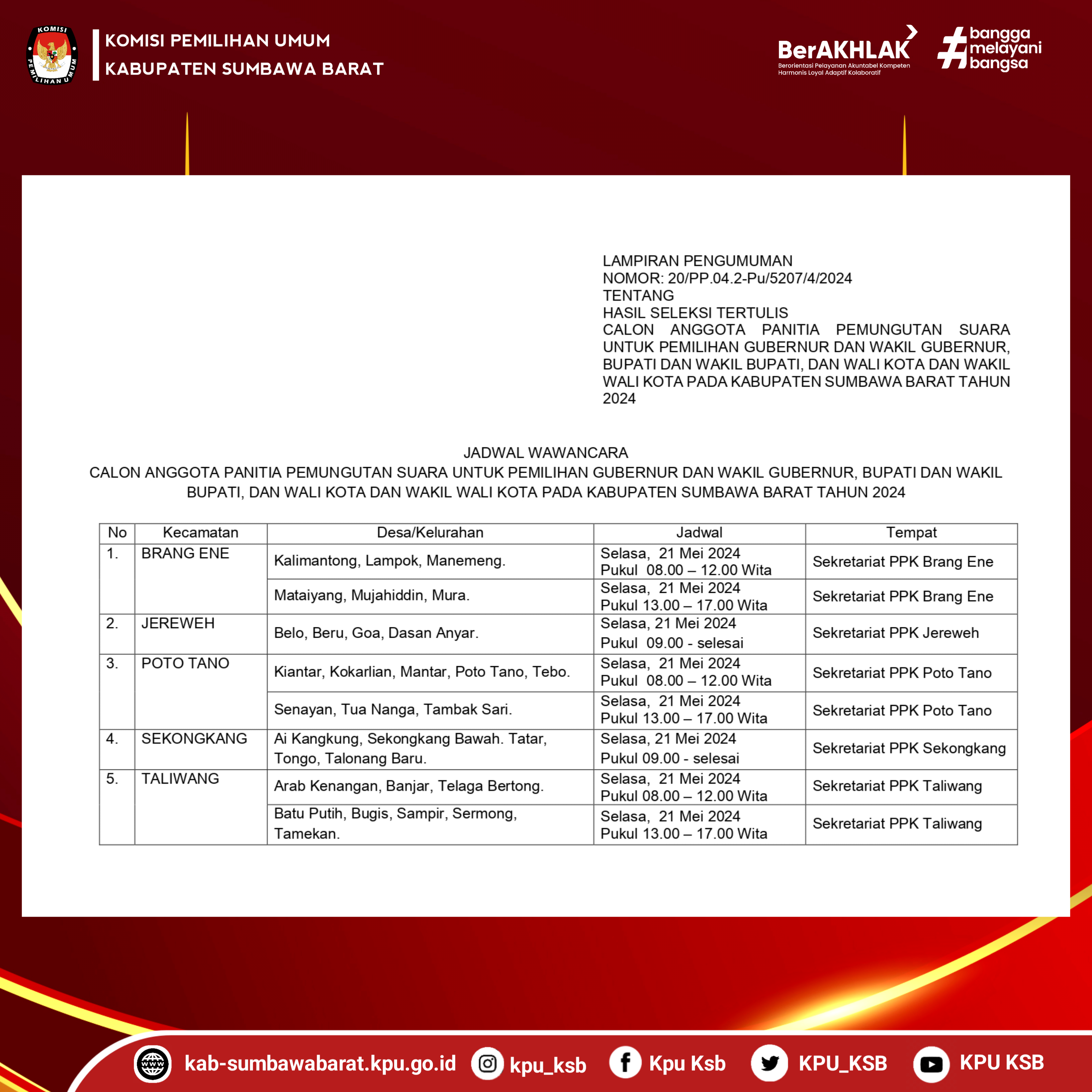 Sumber : Pengumuman Nomor: 21/Pp.04.2-pu/5207/4/2024 TentangJadwal Wawancara Calon Anggota Panitia Pemungutan Suara Untuk Pemilihan Gubernur Dan Wakil Gubernur, Bupati Dan Wakil Bupati, Dan Wali Kota Dan Wakil Wali Kota Pada Kabupaten Sumbawa Barat Tahun 2024