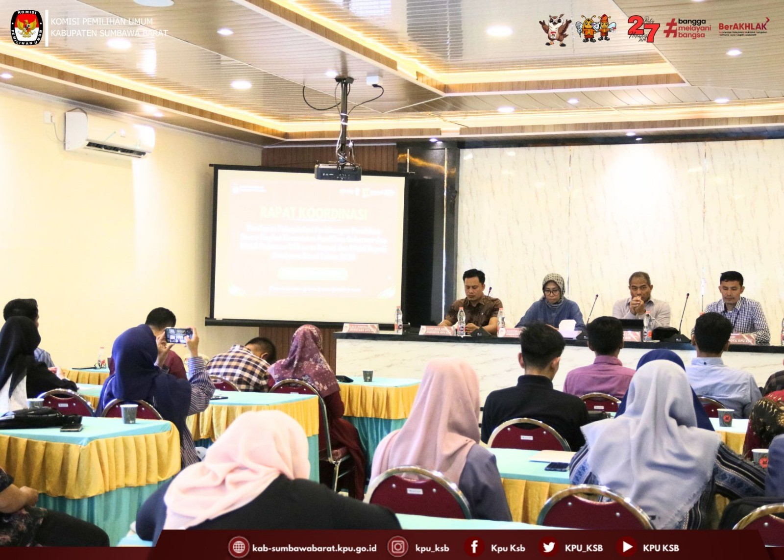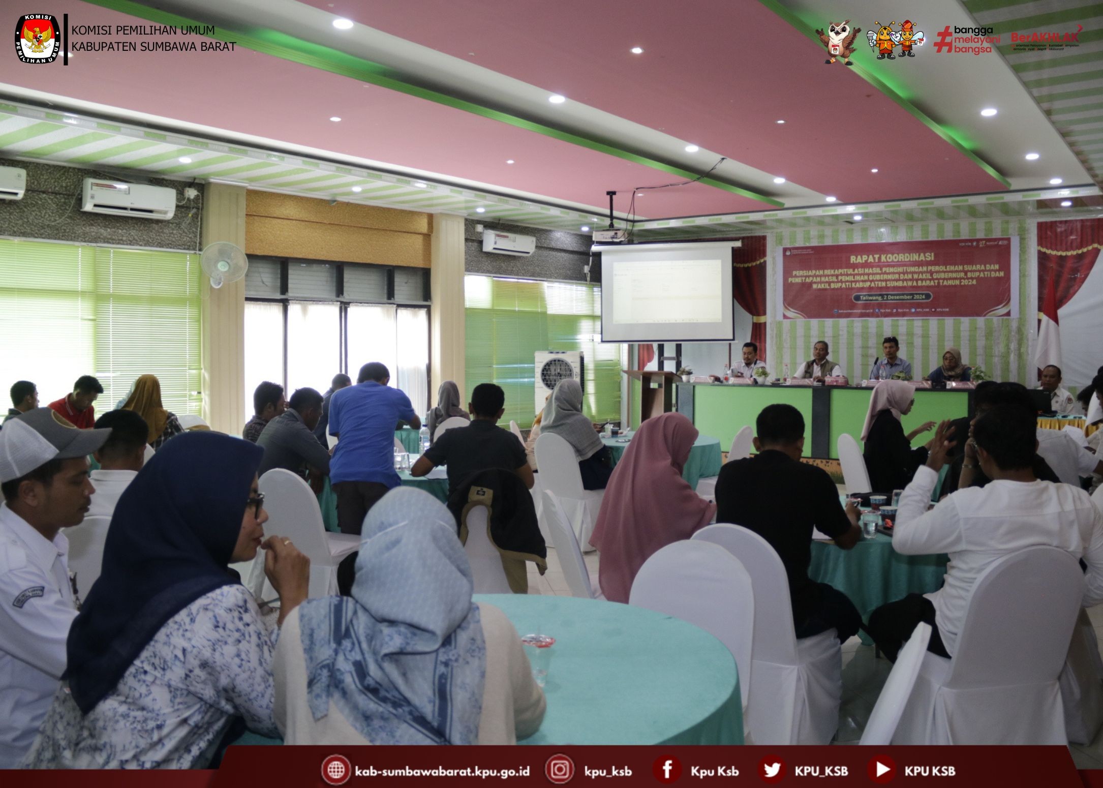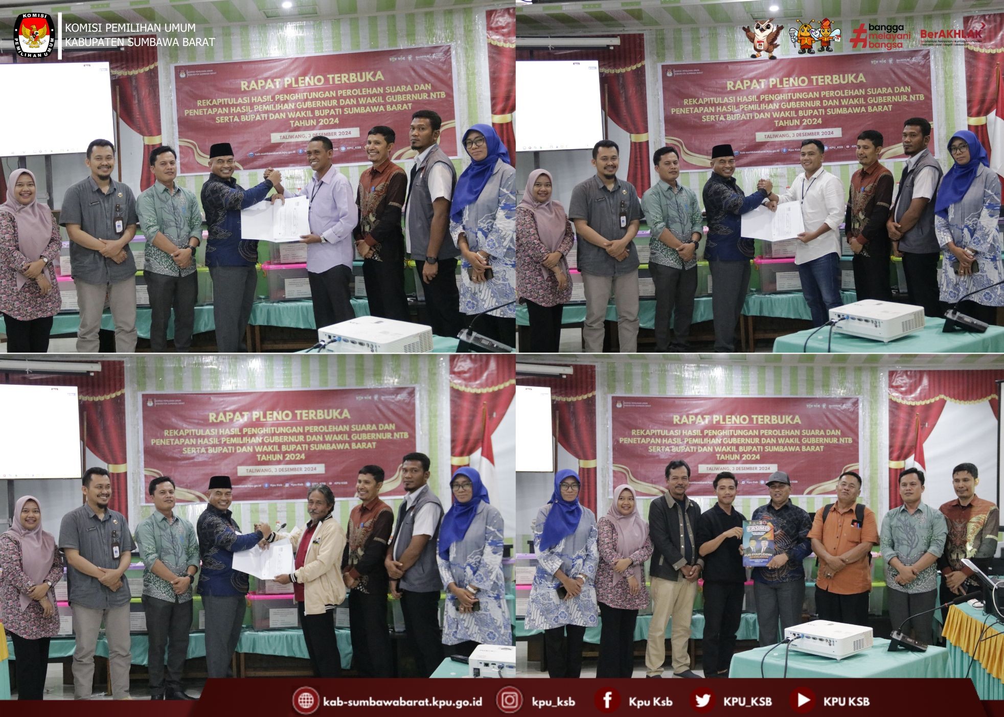 #TemanPemilih, Selasa (3/12/2024) KPU Kabupaten Sumbawa Barat menggelar Rapat Pleno Terbuka Rekapitulasi Hasil Penghitungan Perolehan Suara dalam Pemilihan Gubernur dan Wakil Gubernur NTB serta Bupati dan Wakil Bupati Sumbawa Barat Tahun 2024 Tingkat Kabupaten yang di laksanakan di Aula Kedai Sawah Taliwang. Rapat Pleno Terbuka dipimpin oleh Ketua KPU Kabupaten Sumbawa Barat dan didampingi oleh Anggota KPU Kabupaten Sumbawa Barat. Turut hadir dalam Pembukaan Kegiatan tersebut Kapolres Sumbawa Barat, Dandim 1628 Sumbawa Barat, Bawaslu Kabupaten Sumbawa Barat, Kejari Sumbawa Barat, Dinas Dukcapil, Badan Kesbangpoldagri, Saksi masing-masing Pasangan Calon Gubernur dan Wakil Gubernur NTB serta Bupati dan Wakil Bupati Sumbawa Barat, dan Ketua serta Anggota PPK di 8 Kecamatan se Kabupaten Sumbawa Barat. Ketua KPU Kabupaten Sumbawa Barat (Herman Jayadi) dalam sambutannya menyebutkan bahwa Rapat Pleno Terbuka Rekapitulasi dan Penetapan Hasil Penghitungan Perolehan Suara Pemilihan Gubernur dan Wakil Gubernur NTB serta Bupati dan Wakil Bupati Kabupaten Sumbawa Barat Tahun 2024 Tingkat Kabupaten di laksanakan sesuai jadwal dan akan berjalan sesuai dengan tata tertib yang ditetapkan. Berdasarkan hasil Rekapitulasi yang di bacakan oleh PPK 8 Kecamatan serta saran dan masukan dari Bawaslu Sumbawa Barat, KPU Menetapkan Hasil Perolehan Suara Hasil Pemilihan Bupati dan Wakil Bupati Sumbawa Barat Pada Pilkada Serentak Tahun 2024 dengan perolehan suara sebagai berikut: 1. Pasangan Calon nomor urut 1 atas nama H. Amar Nurmansyah, S.T., M.Si dan Hj. Hanipah, S.Pt., M.M.Inov dengan Perolehan suara sah sebanyak 32.653 (tiga puluh dua ribu enam ratus lima puluh tiga); 2. Pasangan Calon nomor urut 2 atas nama Ahmad Salim, S.T., M.M. dan Muhammad Nasir S.T., M.M. dengan perolehan suara sah sebanyak 15.859 (lima belas ribu delapan ratus lima puluh sembilan); 3. Pasangan Calon nomor urut 3 atas nama Drs. H. M. Nur Yasin dan H. Sumardhan, S.H., M.H dengan perolehan suara sah sebanyak 9.924 (Sembilan ribu Sembilan ratus dua puluh empat); 4. Pasangan Calon nomor urut 4 atas nama Fud Syaifuddin, S.T., M.M.Inov dan Aheruddin, S.E., M.E dengan Perolehan suara sah sebanyak 29.618 (dua puluh Sembilan ribu enam ratus delapan belas); Ketua KPU Sumbawa Barat mengucapkan terimaksih kepada seluruh stakeholder serta seluruh Badan Adhoc dari PPK sampai KPPS yang sudah membantu selama proses Tahapan Pilkada dari awal sampai selesainya rekapitulasi tingkat Kabupaten pada malam ini.