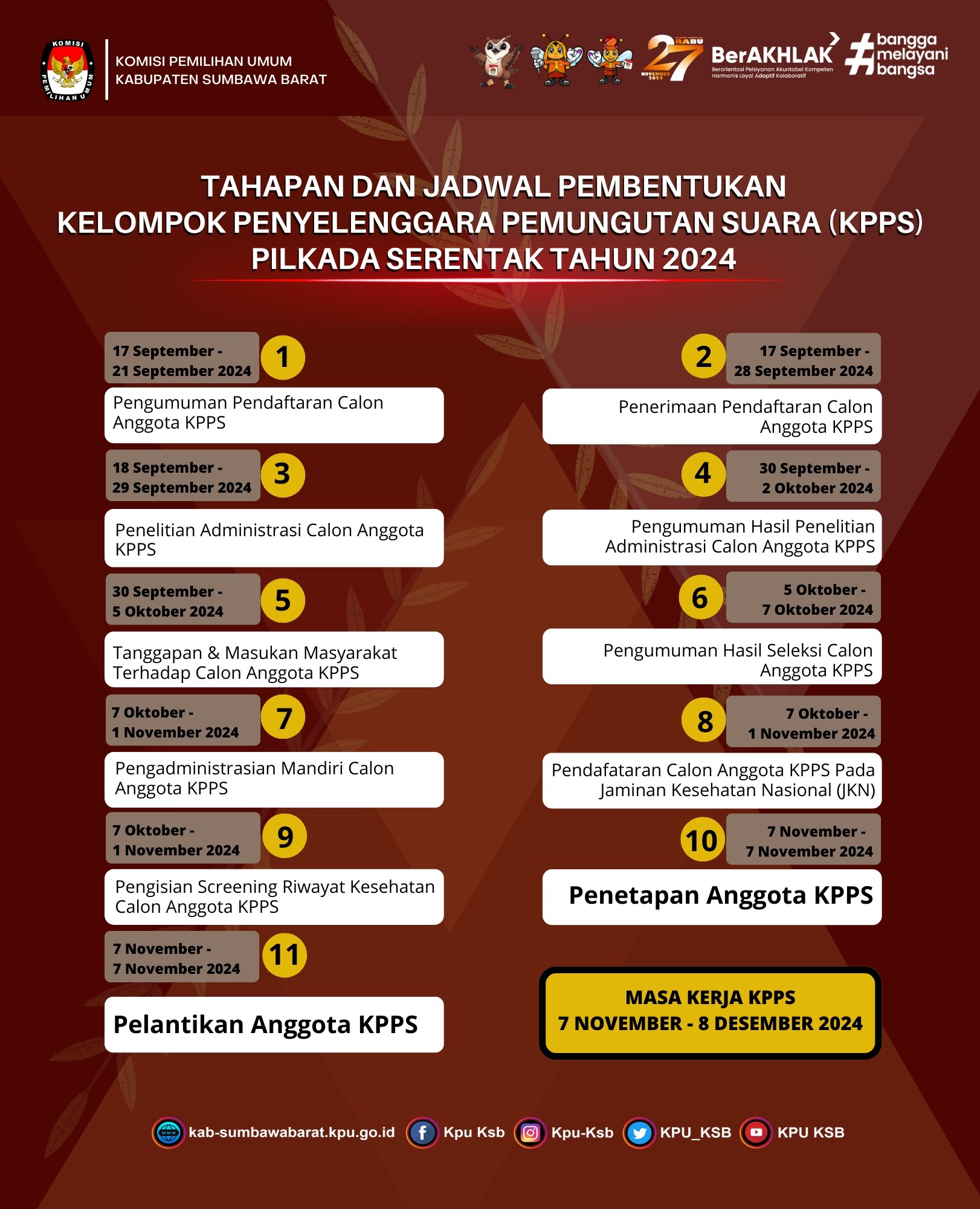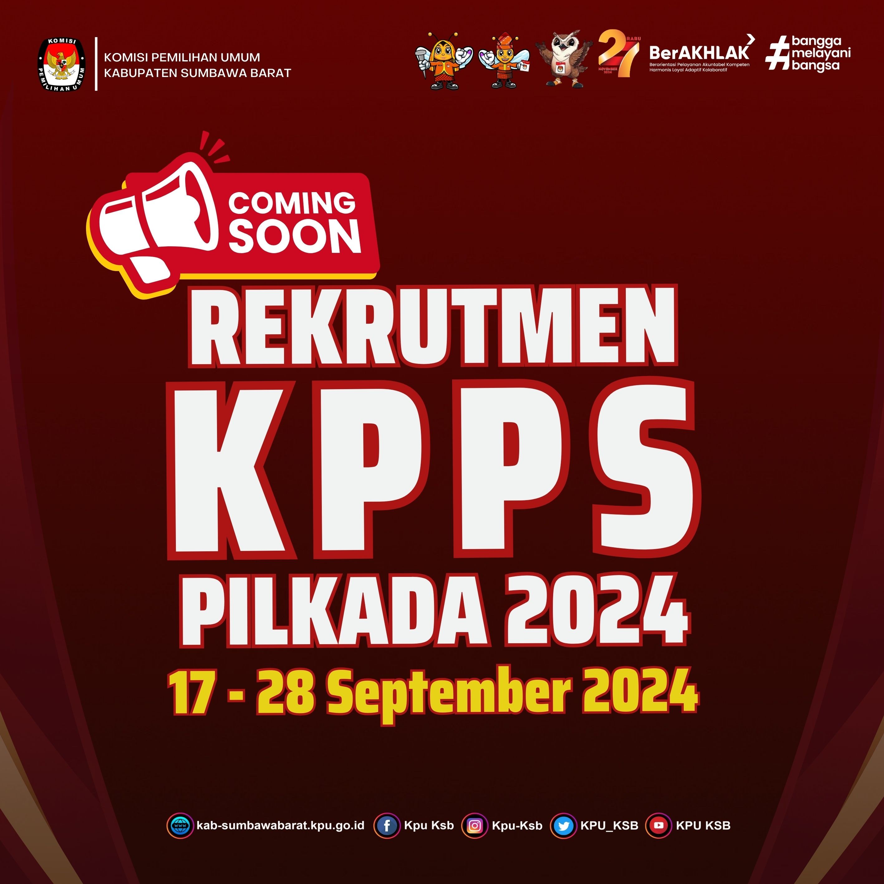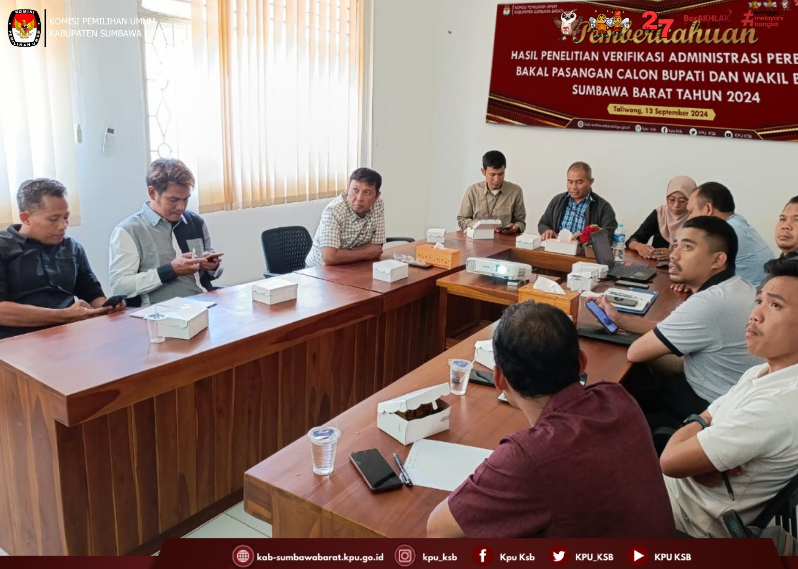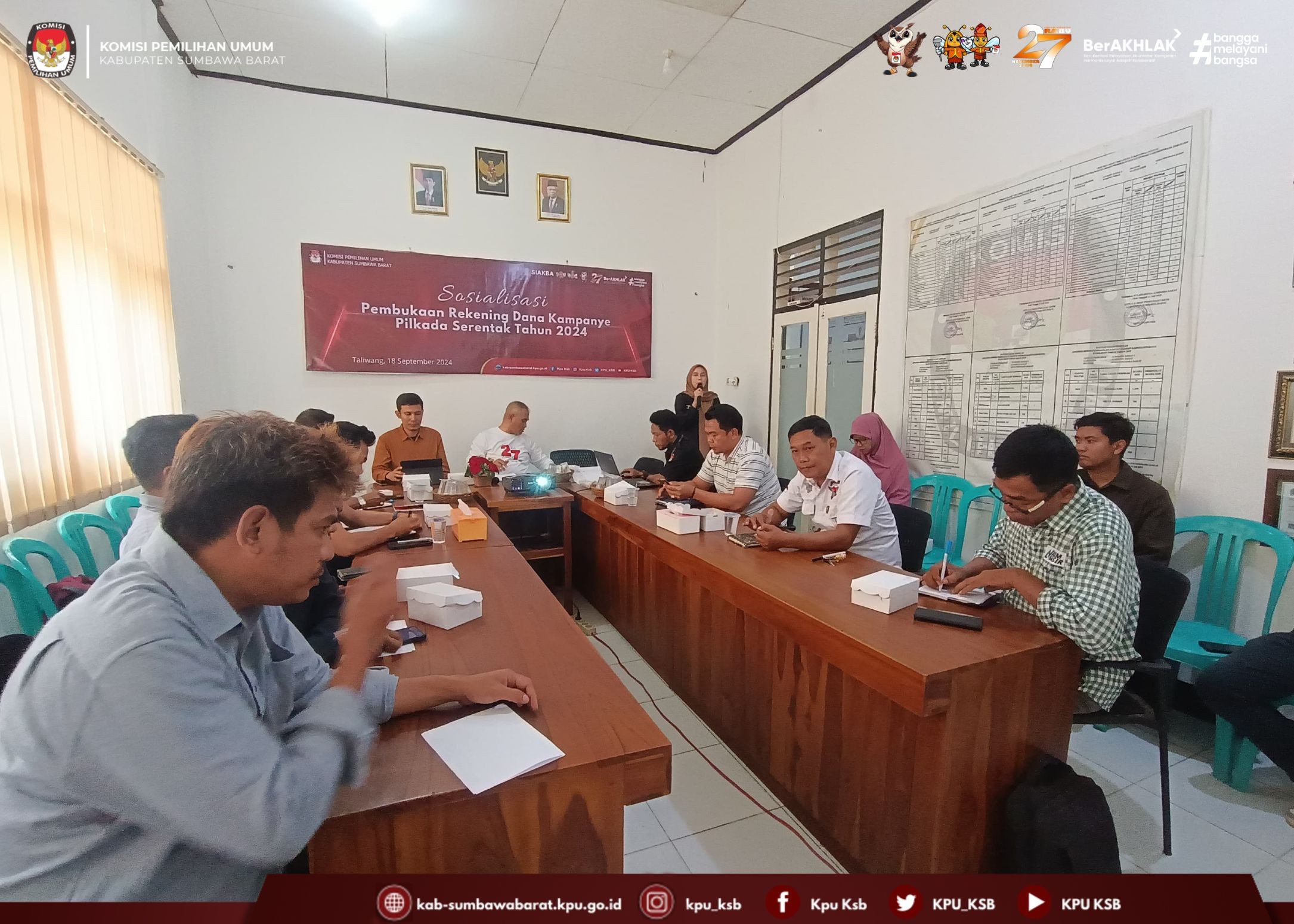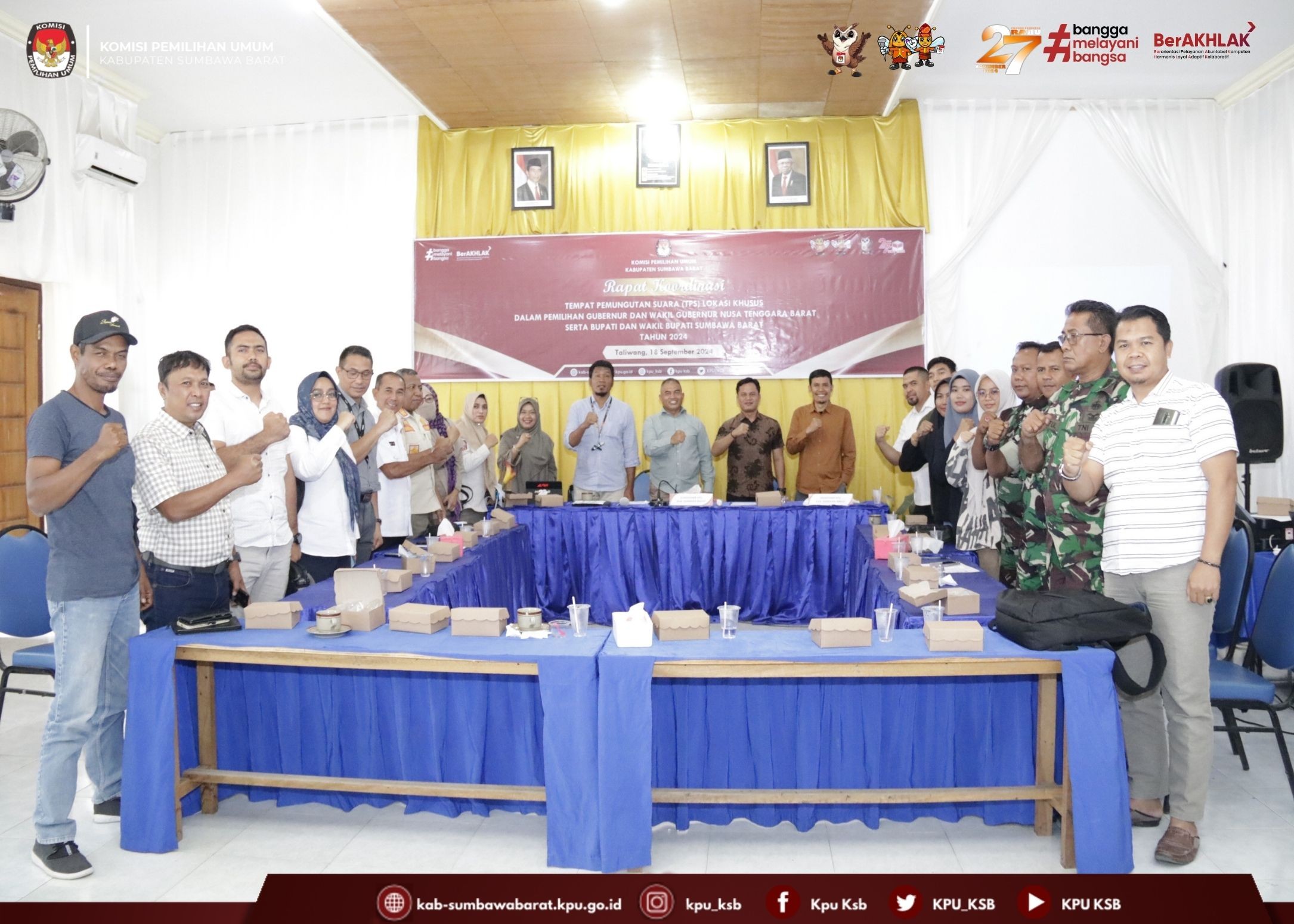 #TemanPemilih, Rabu (18/09/2024) Pukul 08.00 KPU Kabupaten Sumbawa Barat Melakukan Rapat Koordinasi Tempat Pemungutan Suara (TPS) Lokasi Khusus dalam Pemilihan Gubernur dan Wakil Gubernur Nusa Tenggara Barat serta Bupati dan Wakil Bupati Sumbawa Barat. Kegiatan tersebut dibuka sekaligus di pimpin oleh Ketua KPU Sumbawa Barat yang di laksanakan di Aula Hotel Ifa Kota Taliwang. Dalam kegiatan tersebut Kadiv Perencanaan Data dan Informasi menyampaikan tentang jumlah data pemilih lokasi Khusus dan Jumlah TPS yang akan di bentuk di Lokasi Khusus tersebut. Dan di lanjutkan oleh Kadiv Sosdiklih, Parmas dan SDM memaparkan tentang jadwal dan tahapan sekaligus mekanisme pembentukan KPPS di lokasi Khusus, dilanjutkan oleh Kadiv Teknis Penyelenggaraan Pemilu memaparkan tentang Mekanisme Pungut Hitung pada hari Pemungutan Suara. Acara tersebut di hadiri oleh tamu undangan dari Bawaslu, Bakesbangpol, Dandim 1628 Sumbawa Barat, Kapolres, Sat POLPP, Perwakilan Dari PT. AMMNT, LO dari masing-masing Bapaslon serta PPK dan PPS yang terkait dengan terbentuknya TPS Lokasi Khusus tersebut