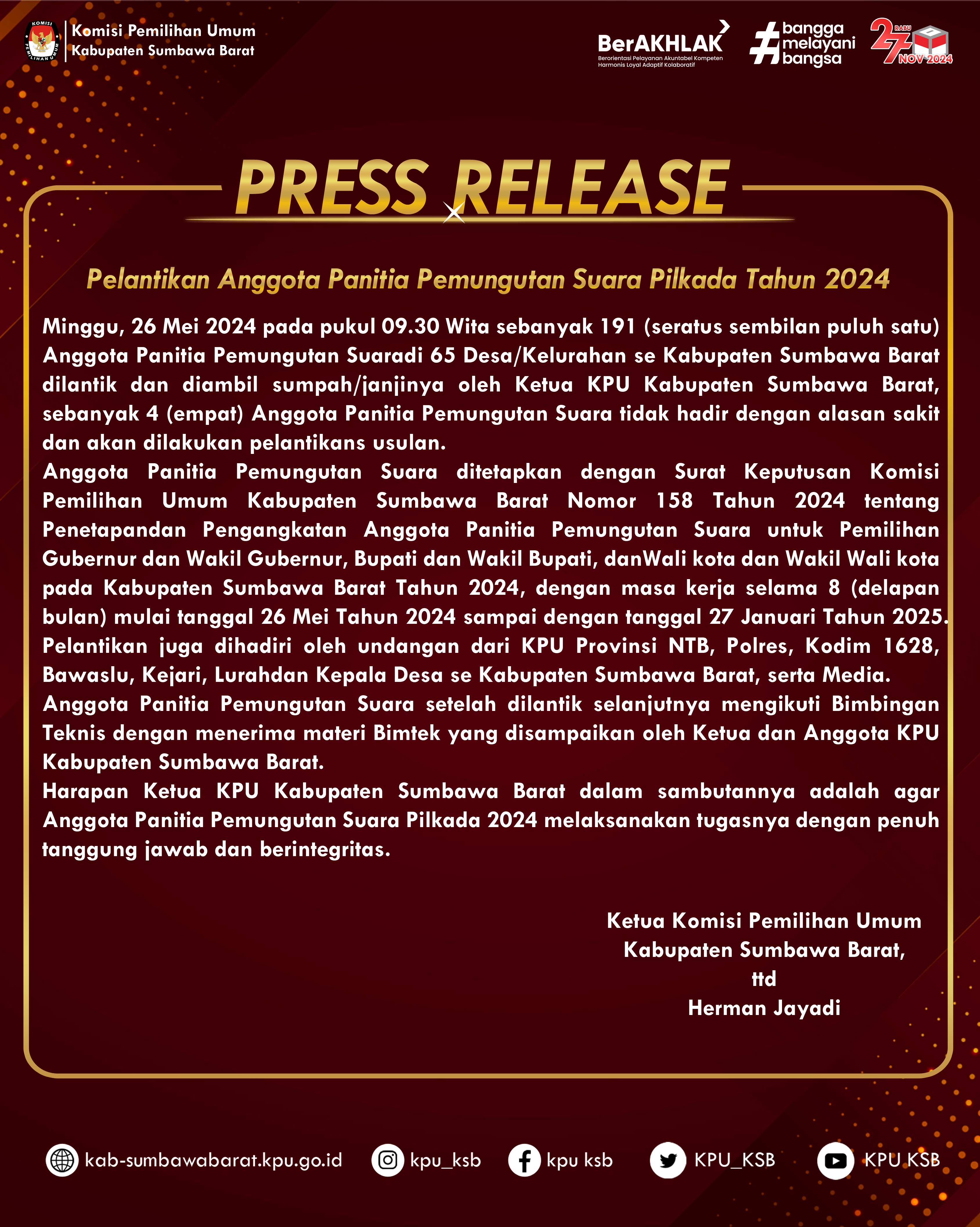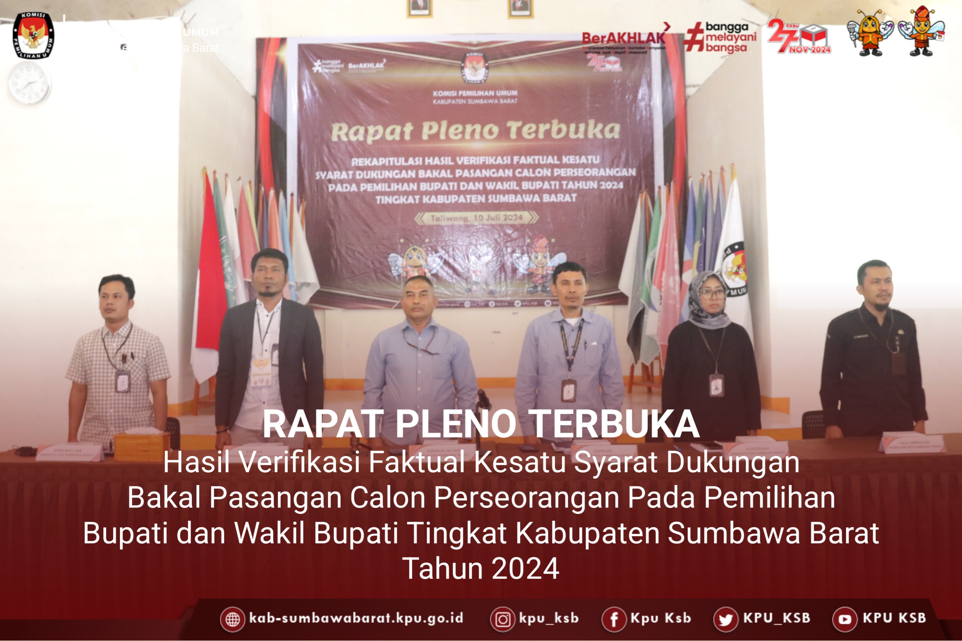 Pada Hari Rabu, 10 Juli 2024, KPU Kabupaten Sumbawa Barat telah melaksanakan Rapat Pleno Terbuka Hasil Verifikasi Faktual Kesatu Syarat Dukungan Bakal Pasangan Calon Perseorangan Pada Pemilihan Bupati dan Wakil Bupati Tingkat Kabupaten Sumbawa Barat Tahun 2024. Rapat pleno terbuka tersebut dilaksanakan di kantor KPU Kabupaten Sumbawa Barat, dan dihadiri langsung oleh Bakal Pasangan Calon yang bersangkutan bersama dengan tim, Bawaslu Sumbawa Barat, PPK, Dandim 1628 Sumbawa Barat, Kepala Kejaksaan Negeri Sumbawa Barat, Kepala Kesbangpol Sumbawa Barat, Serta Tim Media.