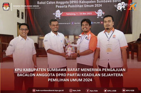 #TemanPemilih, Senin (8/5) Komisi Pemilihan Umum Kabupaten Sumbawa Barat menerima Pendaftaran Bakal Calon Anggota DPRD Kabupaten Sumbawa Barat oleh Partai Keadilan Sejahtera (PKS), di Gedung Serba Guna, KPU KSB. Kedatangan jajaran Partai PKS diterima oleh Ketua dan Anggota, Seluruh Jajaran Sekretariat, Admin serta Operator SILON.