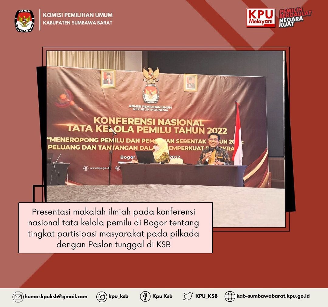 #TemanPemilih, Jalaluddin, M.P Anggota KPU Kabupaten Sumbawa Barat Divisi Teknis Penyelenggara menjadi Pemateri Konferensi Nasional Tata Kelola Pemilu Tahun 2022 dengan tema “Meneropong Pemilu dan Pemilihan Serentak Tahun 2024: Peluang dan Tantangan dalam Memperkuat Demokrasi”, Senin (4/04) di Bogor, Jawa Barat.