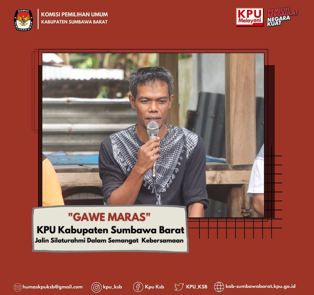 Agenda rutin KPU Kabupaten Sumbawa Barat setiap minggu ke-4 setiap bulan diisi dengan kegiatan yang diberi tema “Gawe Maras” yaitu kegiatan bersilaturahmi atau mengunjungi rumah antar rekan kerja. Kegiatan bersilaturahmi kali ini (Jumat, 25 Februari 2022) bertempat dikediaman Bapak Herman Jayadi, S.AP. Dalam sambutannya beliau menyampaikan bahwa kegiatan bersilahturahmi atau mengunjungi rumah antar rekan kerja ini diyakini mampu meningkatkan tali silaturahmi antar pegawai KPU KSB, sekaligus menjadi wadah menjalin kekompakan antar Komisioner dan Sekretariat sehingga seluruh jajaran KPU KSB semakin betah saat bekerja. Dalam kesempatan yang sama Ketua KPU KSB Bapak Denny Saputra, S.Pd juga menyampaikan bahwa kegiatan ini dilaksanakan untuk menjalin keharmonisan dan kebersamaan seluruh jajaran KPU KSB. Keharmonisan dan kebersamaan ini diharapkan membawa efek “MARAS” meskipun saat sedang serius menjalankan tugas-tugas dikantor. Kegiatan yang diikuti oleh seluruh jajaran Komisioner dan Sekretariat KPU KSB ini diisi pula dengan Kultum singkat dari Bapak Rahmat Riadi, S.Sos.I.,M.Si “Silaturahmi perlu dilestarikan Semoga kita mendapat keutamaan” ujar beliau saat menutup kultumnya.