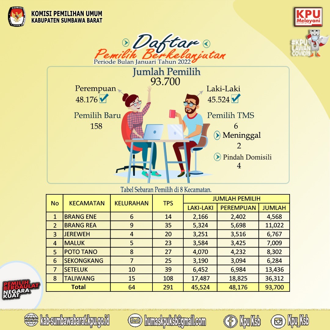 “ KPU Kabupaten Sumbawa Barat melaksanakan Rapat Pleno Rekapitulasi Daftar Pemilih Berkelanjutan Tahun 2022 periode bulan Januari” Senin (31/01/2022) mengawali tahun 2022 KPU Kabupaten Sumbawa Barat melaksanakan Rapat Pleno Rekapitulasi Daftar Pemilih Berkelanjutan Tahun 2022 periode bulan Januari, bertempat di ruang aula kantor KPU Kabupaten Sumbawa Barat. Rapat dipimpin langsung oleh Ketua KPU Kabupaten Sumbawa Barat, Bapak Denny Saputra, S.Pd dan dihadiri oleh seluruh Anggota, Sekretaris dan Kasubbag lingkup KPU Kabupaten Sumbawa Barat. Hasil rapat dituangkan dalam Berita Acara Nomor : 009/PL.02.1/5207/3/2022 yang menetapkan jumlah Daftar Pemilih Berkelanjutan periode bulan Januari tahun 2022 di tingkat Kabupaten Sumbawa Barat Sebanyak 93.700 Pemilih dengan rincian 45.524 pemilih Laki-laki dan 48.176 Pemilih perempuan, dimana terjadi kenaikan jumlah Pemilih sebesar 152 Pemilih dari Pemilih bulan sebelumnya dengan rincian Pemilih Baru sebanyak 158 Pemilih dan Pemilih yang Tidak Memenuhi Syarat (TMS) sebanyak 6 Pemilih. Dalam Kesempatan tersebut Ketua KPU Kabaputen Sumbawa Barat menyampaikan bahwa dalam menjaga kualitas Data Pemilih, KPU Kabupaten Sumbawa Barat terus berupaya menghadirkan data Pemilih yang akurat dan mutakhir dengan terus berkoordinasi dengan Stakeholder terkait dalam menyongsong Pemilu dan Pemilihan Serentak Tahun 2024 mendatang. #ReformasiBirokrasi #Gawe Maras Berita Acara Pleno Daftar Pemilih Berkelanjutan dapatkan >> DI SINI<<