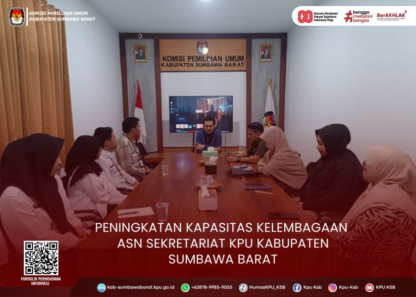 Kamis 14 Agustus 2025, Sekretariat KPU Kabupaten Sumbawa Barat dalam upaya meningkatkna kapasitas kelembagaan ASN Sekretariat KPU Kabupaten Sumbawa Barat, melaksanakan Sosialisasi tentang Tugas, Fungsi, Susunan Organisasi, dan Tata Kerja Sekretariat Jenderal KPU, Sekretariat KPU Provinsi, dan Sekretariat KPU Kabupaten/Kota.