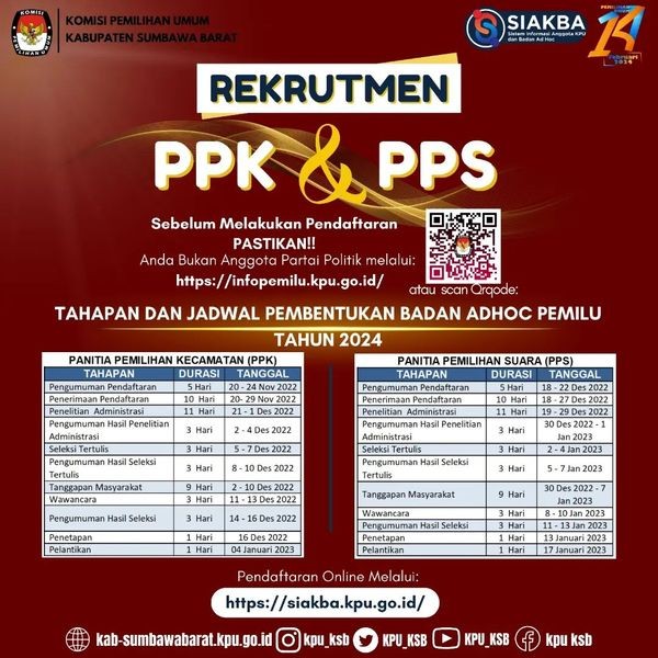 Kamu perlu tahu, inilah berkas yang harus TemanPemilih siapkan untuk mendaftar menjadi PPK dan PPS Pemilu dan Pemilihan 2024 melalui SIAKBA. Sambil menunggu pembukaan secara resmi, yuk segera siapkan berkas-berkasnya Sob... ! 1. Pas Foto - Pdf 2. KTP - EL - Pdf 3. Ijazah Terakhir - Pdf 4. Surat Keterangan Sehat - Pdf 5. Surat Pendaftaran - Pdf 6. Surat Pernyataan - Pdf 7. Daftar Riwayat Hidup – Pdf Surat Pendaftaran, Surat Pernyataan, dan Daftar Riwayat Hidup tersedia pada SIAKBA saat melakukan Pendaftaran. Semua Berkas Pendaftaran Di Upload Pada SIAKBA Dalam Bentuk File Dengan Ukuran Maksimal 1 Mb Link Pendaftaran: https://siakba.kpu.go.id/ Panduan membuat akun dan pendaftaran pada SIAKBA dapat sobat download pada link: http://bit.ly/PANDUAN_SIAKBA Apabila Terdapat Kendala pada saat pendaftaran, Silahkan TemanPemilih Konsultasi melalui Email: sdmkpuksb@gmail.com, atau gabung dalam WAG https://chat.whatsapp.com/GUp3l2sf4lb6KRrP0g8K3m #KPUMelayani #Integritas24Jam #PemiluSerentak2024