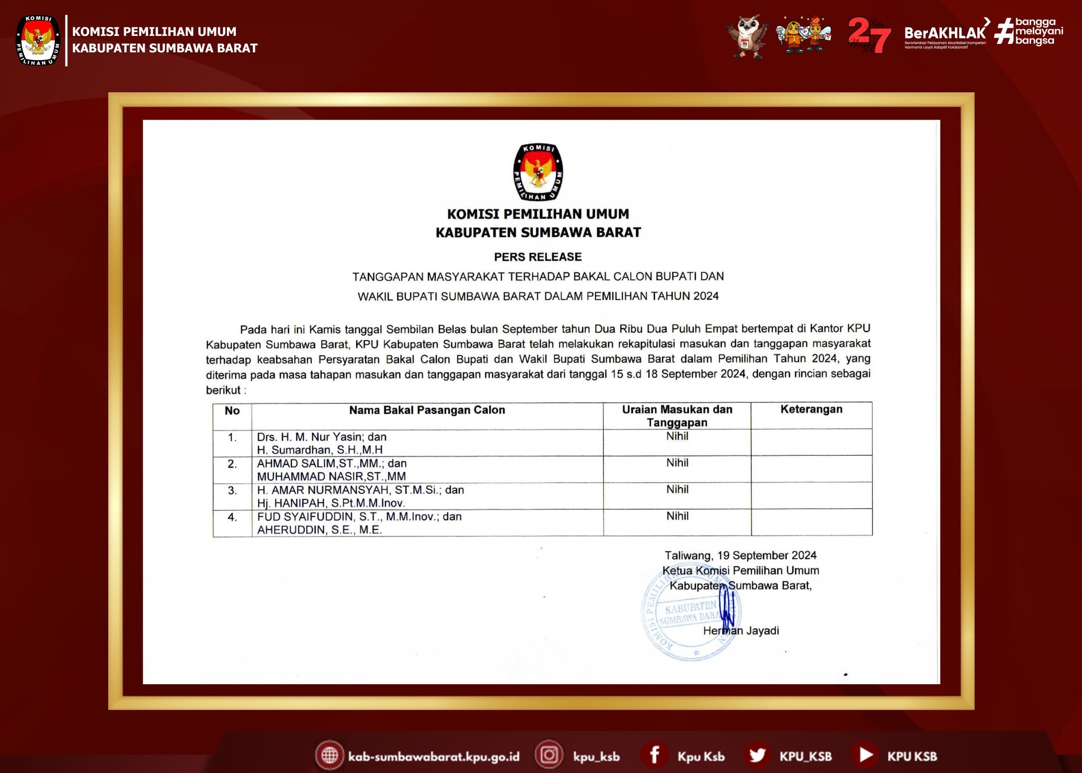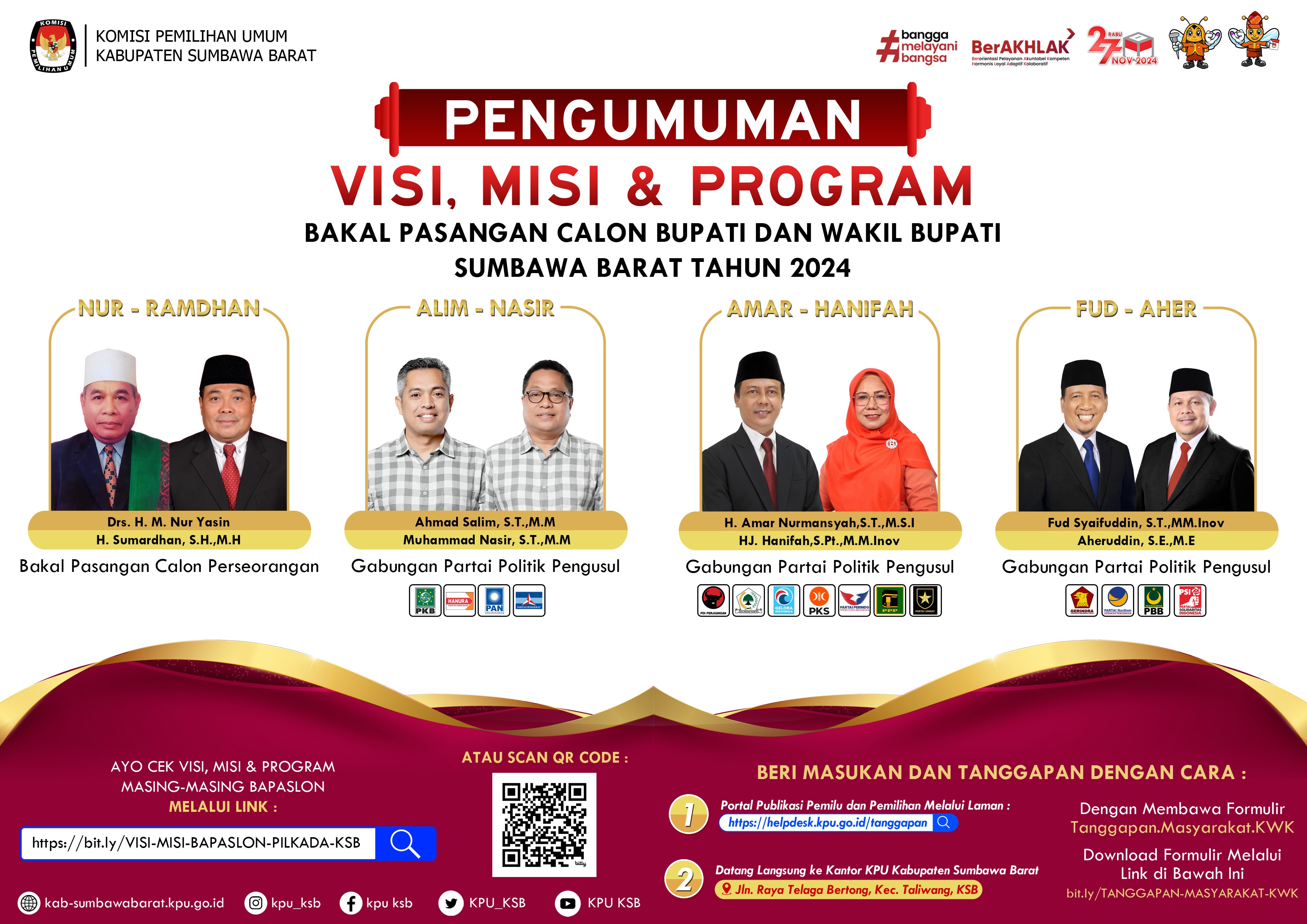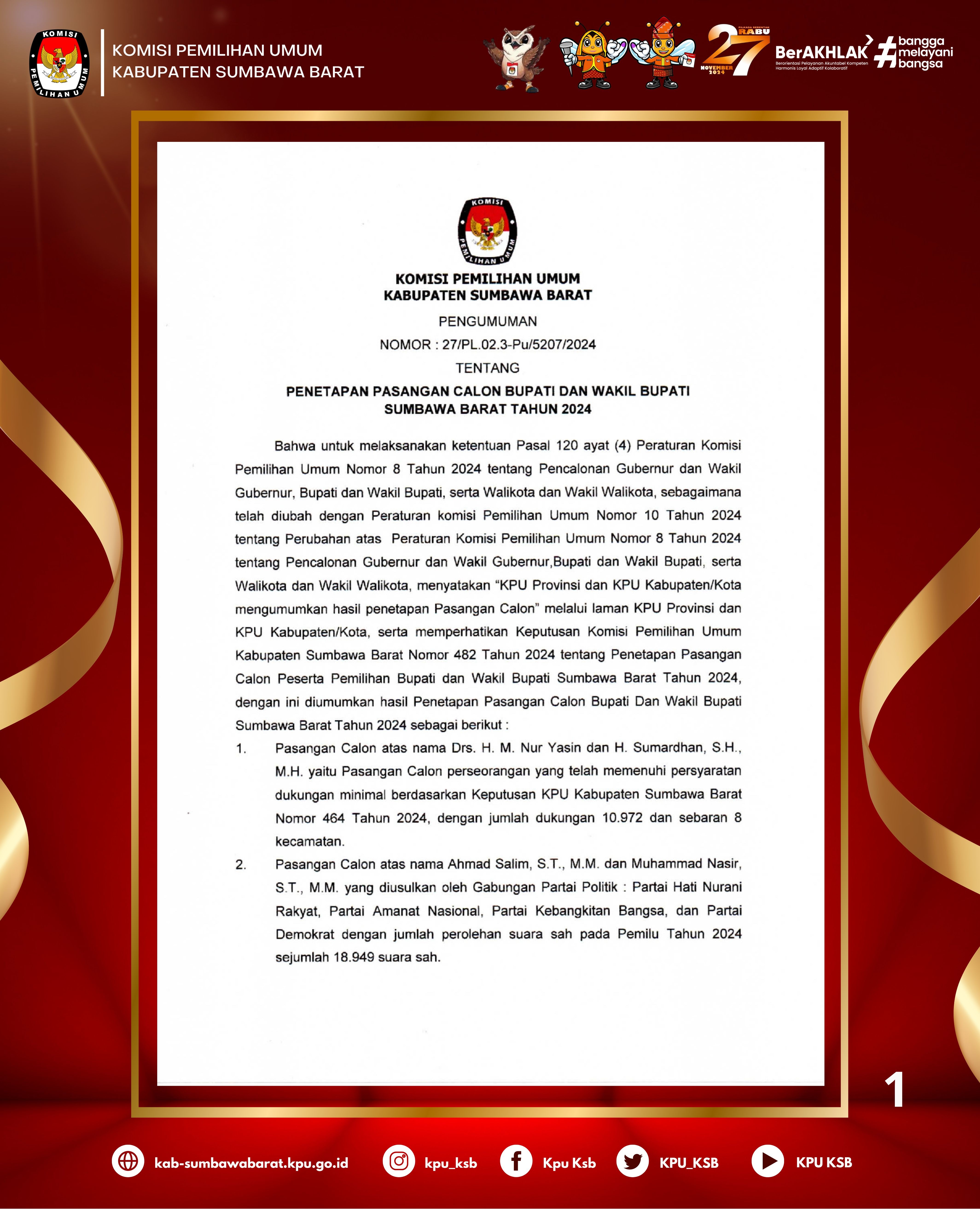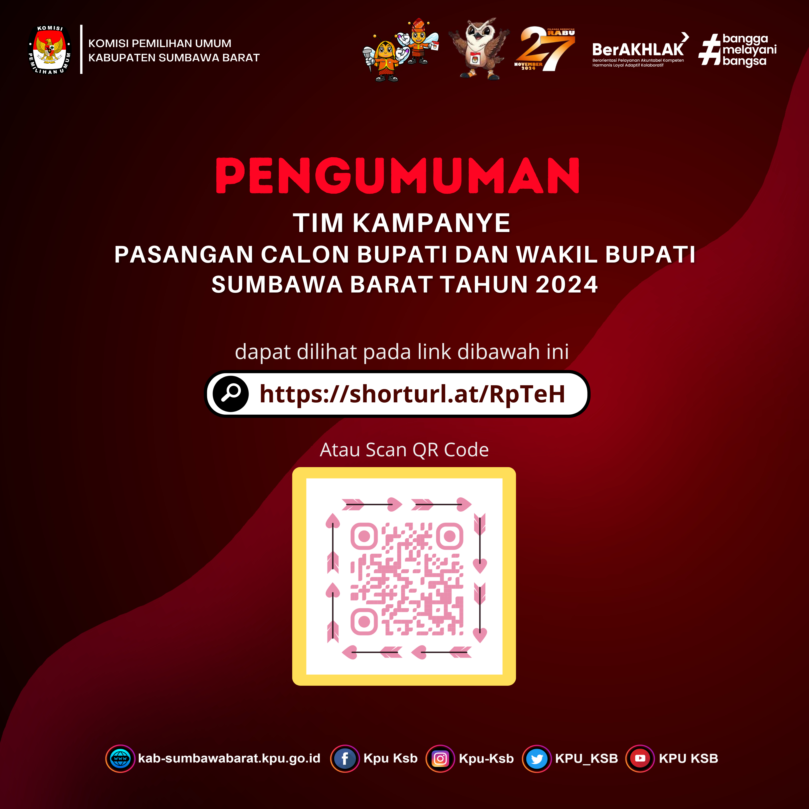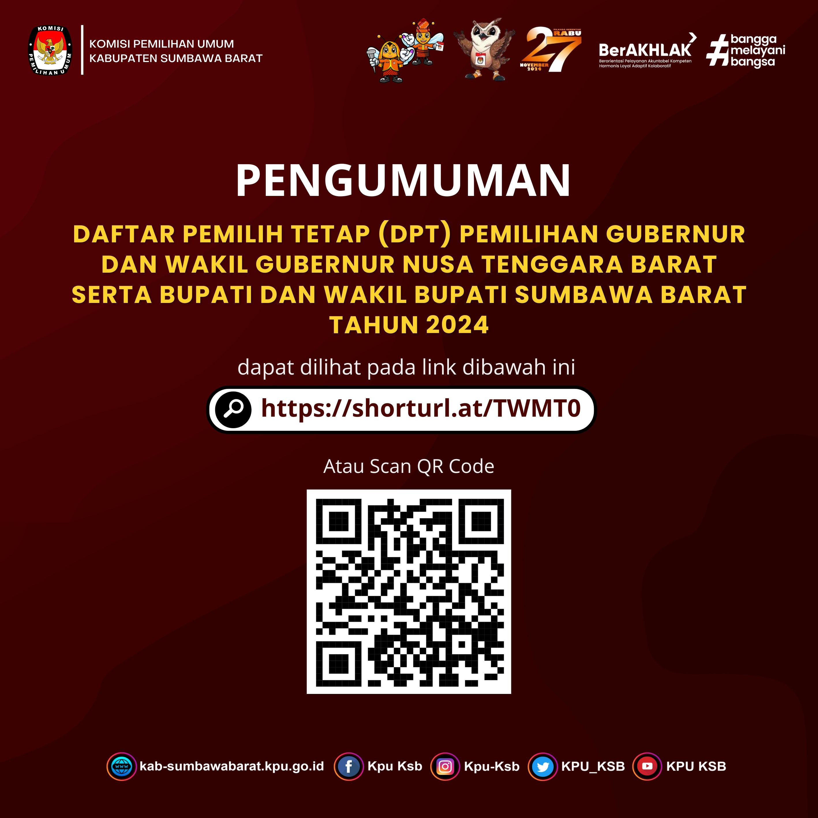 #TemanPemilih Berikut kami sampaikan Pengumuman Nomor: 26//PP.04.2-Pu/5207/4/2024 Tentang Pendaftaran Calon Anggota Kelompok Penyelenggara Pemungutan Suara Untuk Pilkada Tahun 2024 dalam Pemilihan Gubernur dan Wakil Gubernur Nusa Tenggara Barat serta Bupati dan Wakil Bupati Sumbawa Barat.