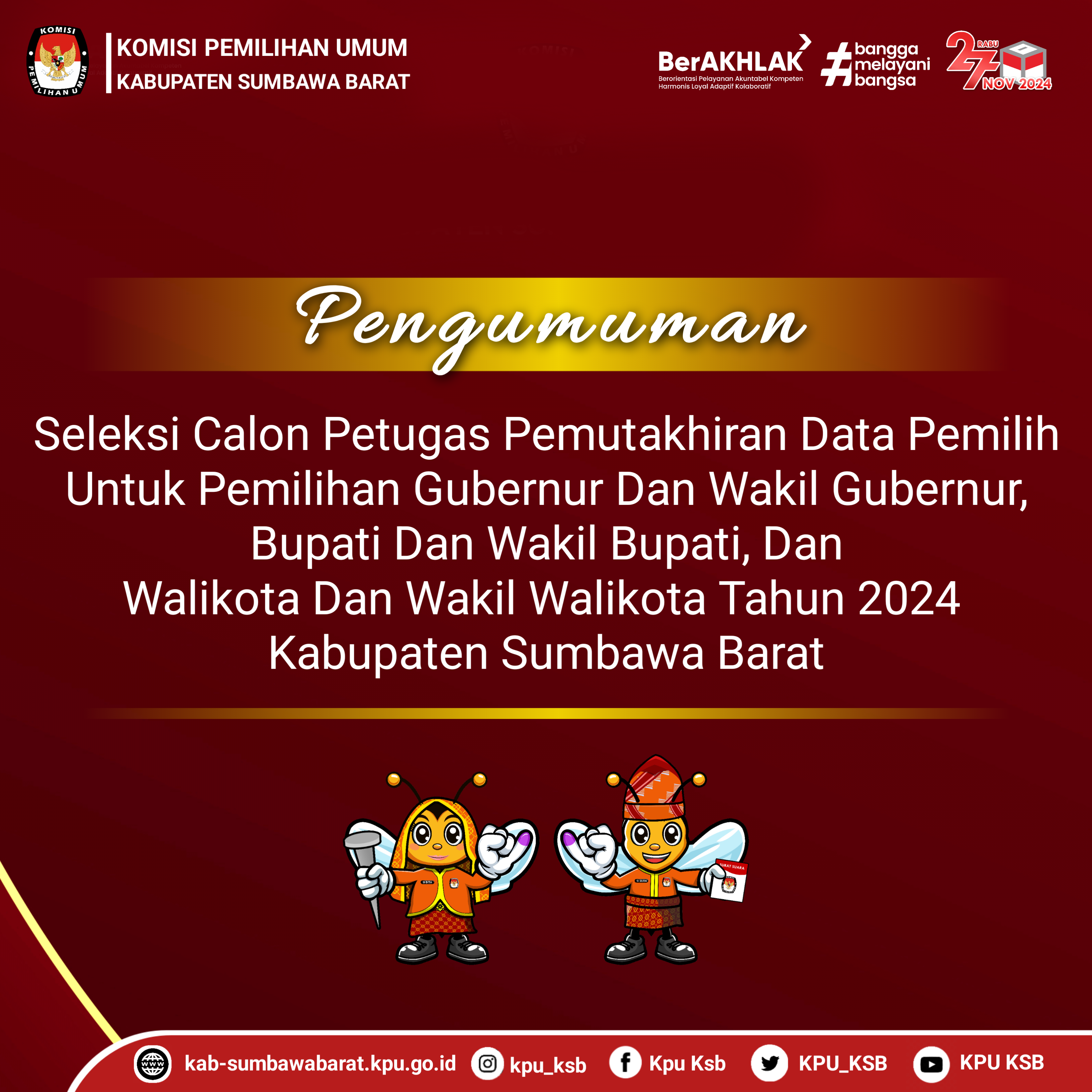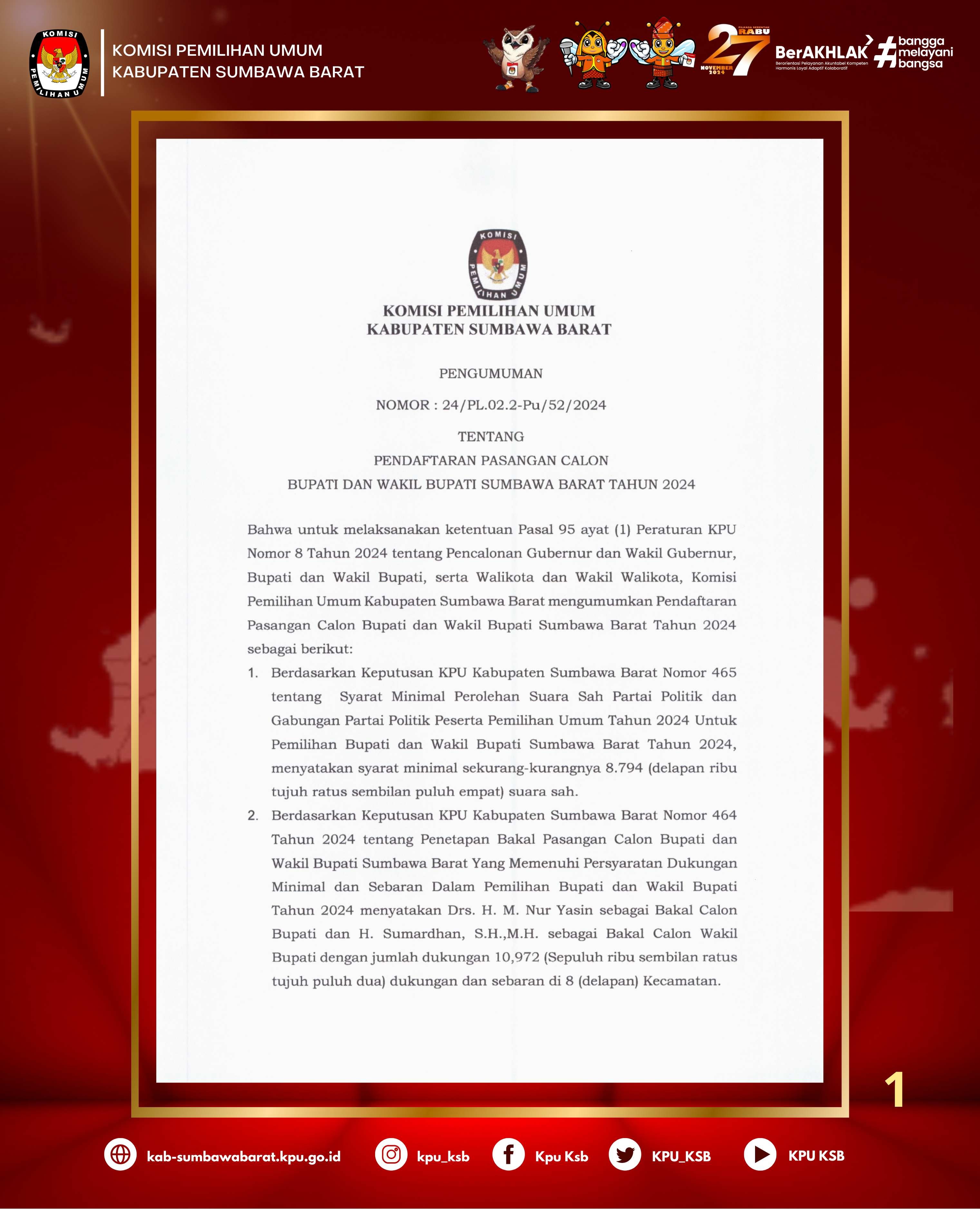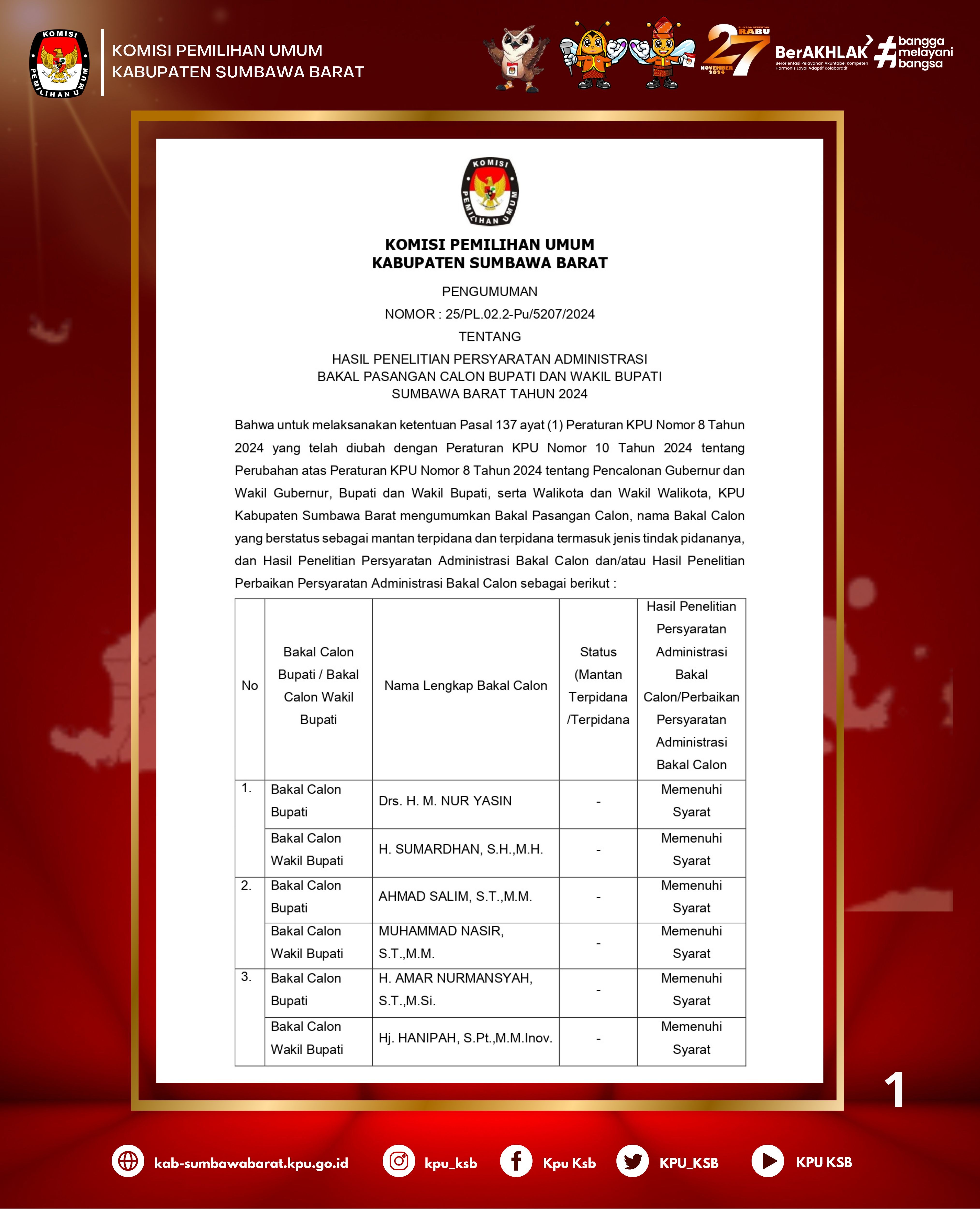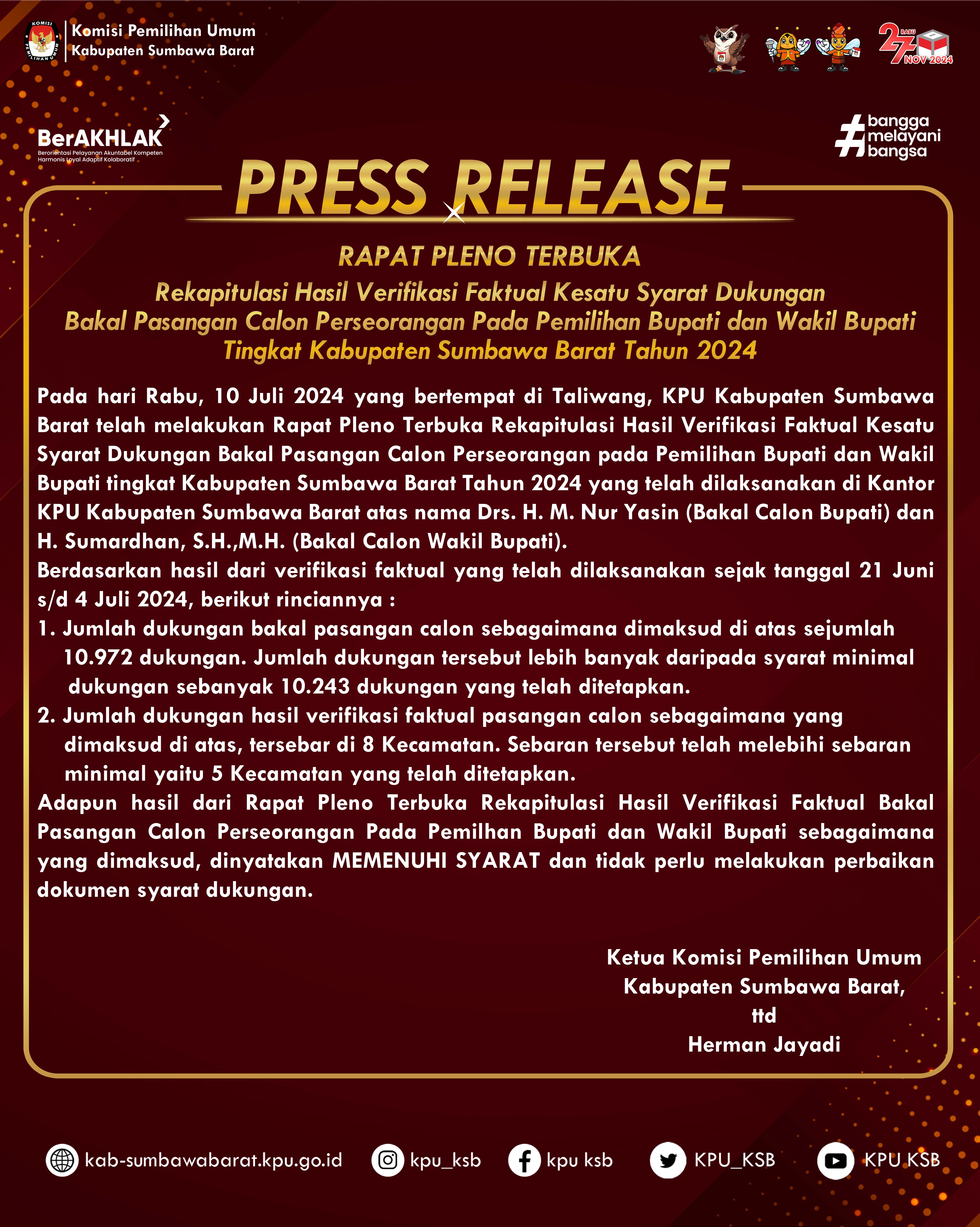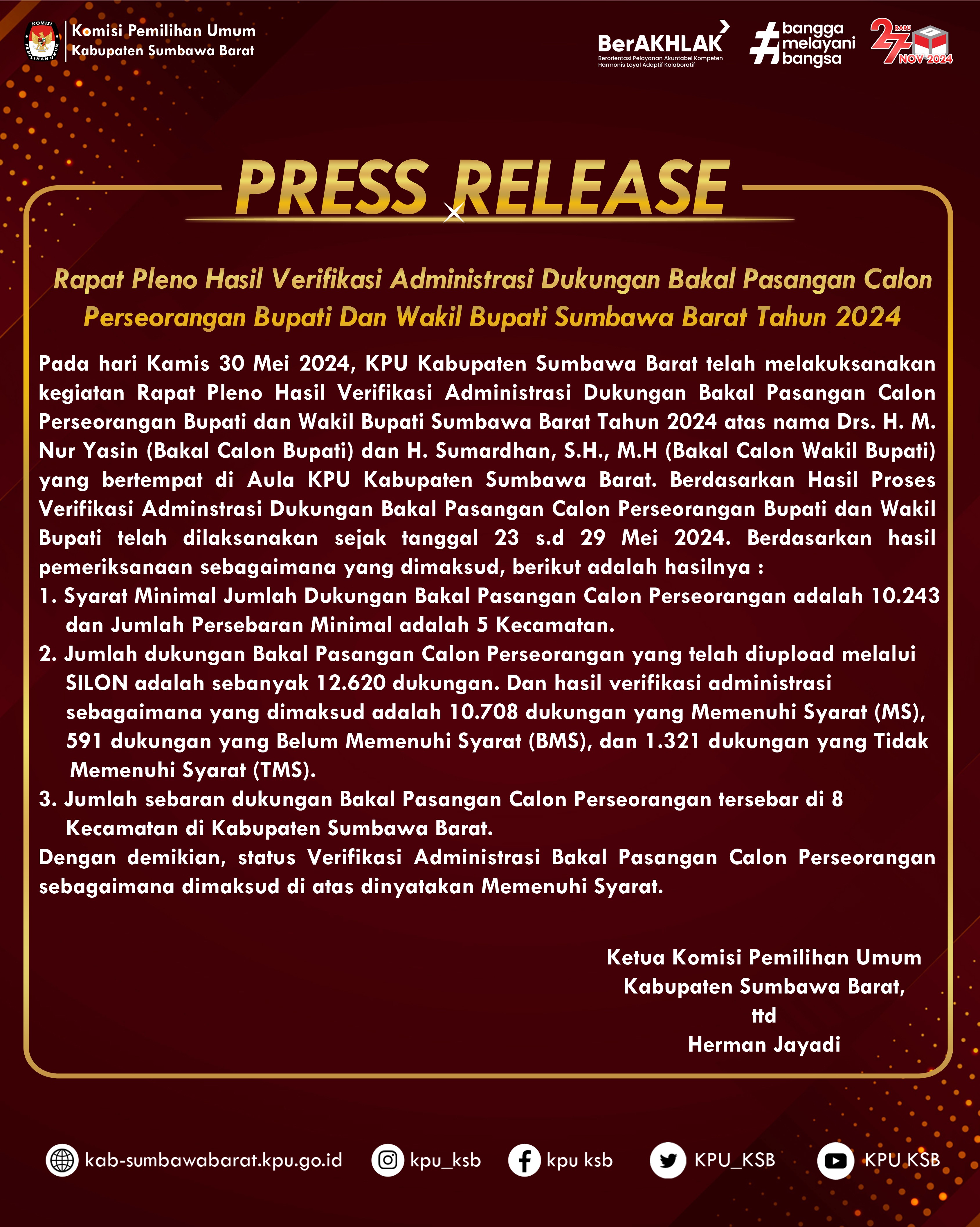 Pada hari Kamis 30 Mei 2024, KPU Kabupaten Sumbawa Barat telah melakuksanakan kegiatan Rapat Pleno Hasil Verifikasi Administrasi Dukungan Bakal Pasangan Calon Perseorangan Bupati dan Wakil Bupati Sumbawa Barat Tahun 2024 atas nama Drs. H. M. Nur Yasin (Bakal Calon Bupati) dan H. Sumardhan, S.H., M.H (Bakal Calon Wakil Bupati) yang bertempat di Aula KPU Kabupaten Sumbawa Barat. Berdasarkan Hasil Proses Verifikasi Adminstrasi Dukungan Bakal Pasangan Calon Perseorangan Bupati dan Wakil Bupati telah dilaksanakan sejak tanggal 23 s.d 29 Mei 2024. Berdasarkan hasil pemeriksanaan sebagaimana yang dimaksud, berikut adalah hasilnya : 1. Syarat Minimal Jumlah Dukungan Bakal Pasangan Calon Perseorangan adalah 10.243 dan Jumlah Persebaran Minimal adalah 5 Kecamatan. 2. Jumlah dukungan Bakal Pasangan Calon Perseorangan yang telah diupload melalui SILON adalah sebanyak 12.620 dukungan. Dan hasil verifikasi administrasi sebagaimana yang dimaksud adalah 10.708 dukungan yang Memenuhi Syarat (MS), 591 dukungan yang Belum Memenuhi Syarat (BMS), dan 1.321 dukungan yang Tidak Memenuhi Syarat (TMS). 3. Jumlah sebaran dukungan Bakal Pasangan Calon Perseorangan tersebar di 8 Kecamatan di Kabupaten Sumbawa Barat. Dengan demikian, status Verifikasi Administrasi Bakal Pasangan Calon Perseorangan sebagaimana dimaksud di atas dinyatakan Memenuhi Syarat.