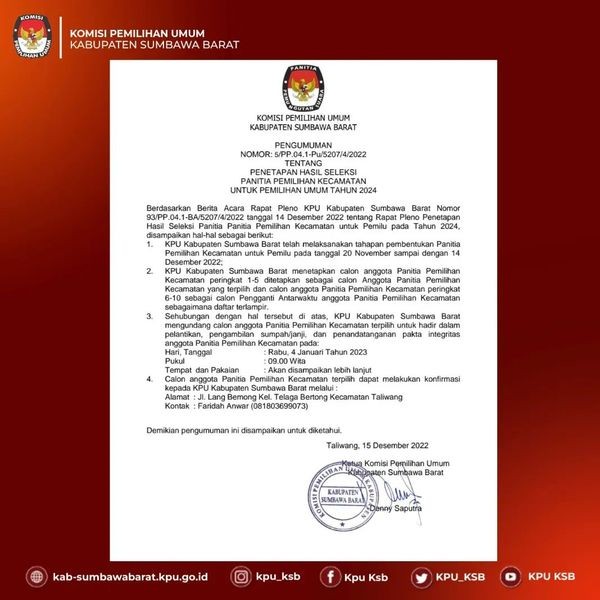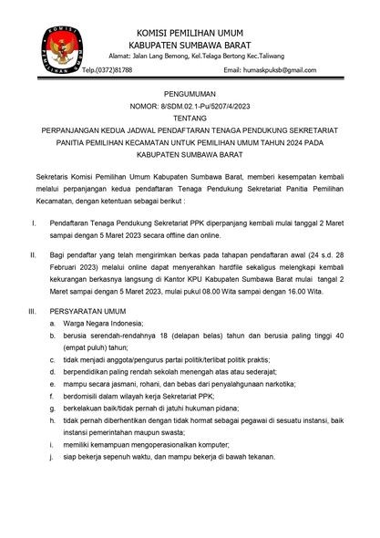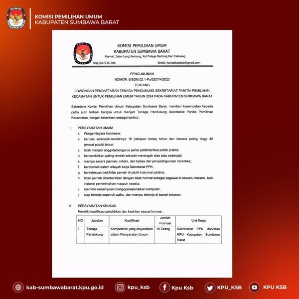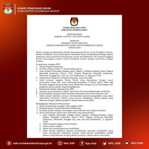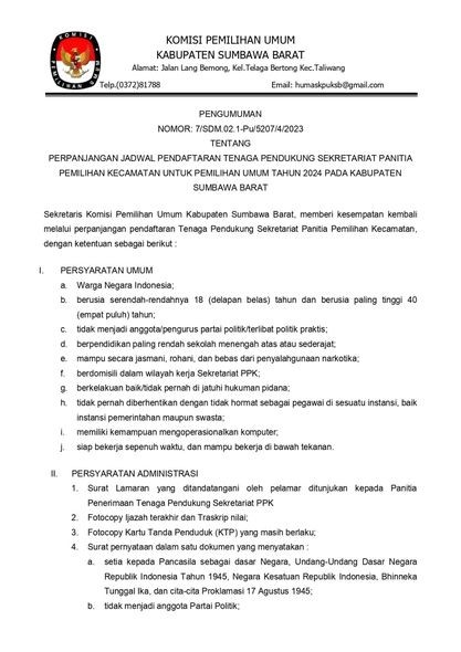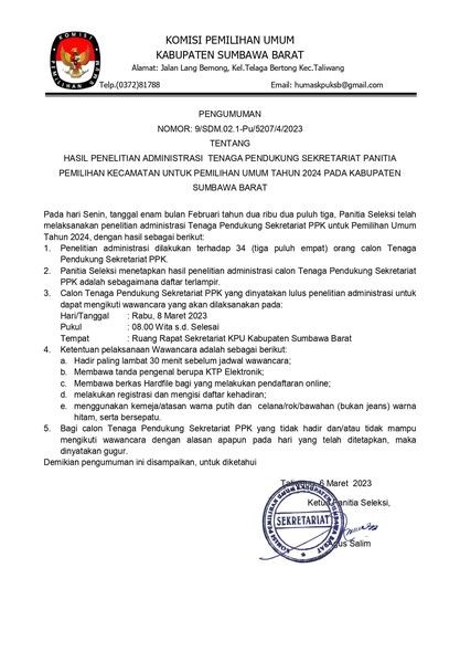 #TemanPemilih berikut kami sampaikan Pengumuman Nomor: 9/SDM.02.1-Pu/5207/4/2023 tentang Hasil Penelitian Administrasi Tenaga Pendukung Sekretariat Panitia Pemilihan Kecamatan untuk Pemilu 2024 Pada Kabupaten Sumbawa Barat